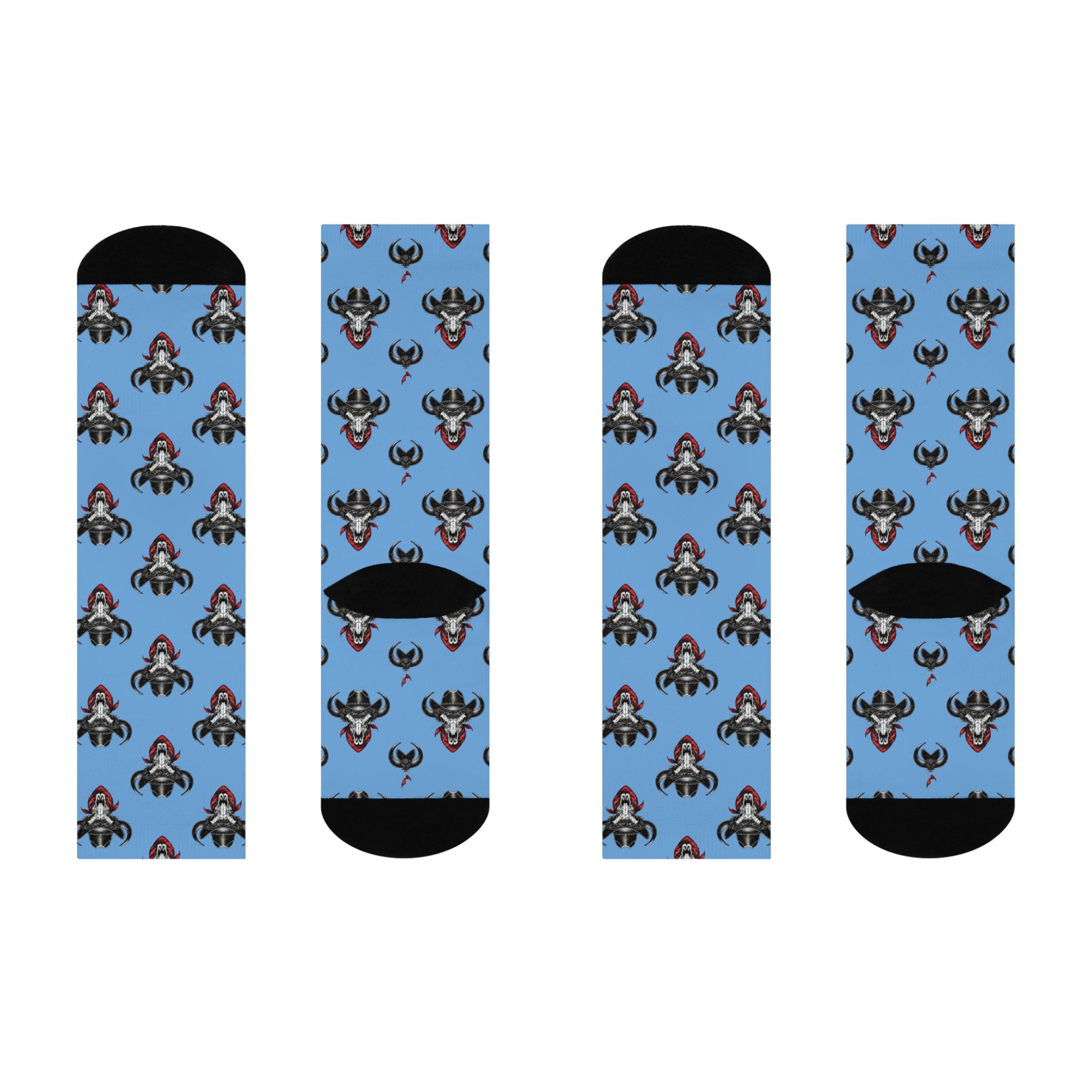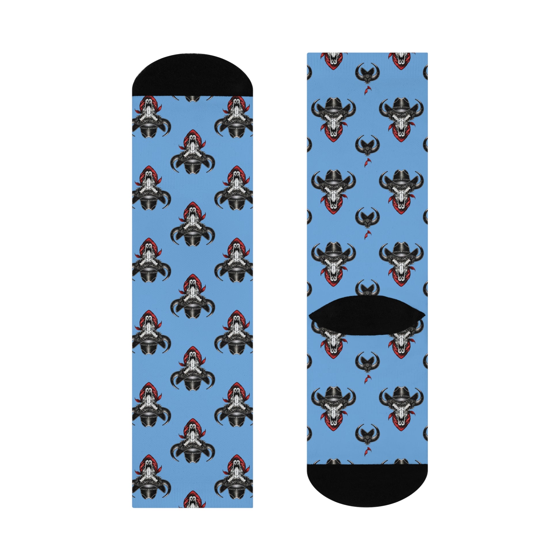 Turn heads from the ground up with our Cowboy Skull Crew Socks, featuring a fierce all-over print of our signature bull skull in a cowboy hat and bandana. These socks are made for folks who live loud, ride hard, and don’t mind showing a little attitude—even on their ankles.