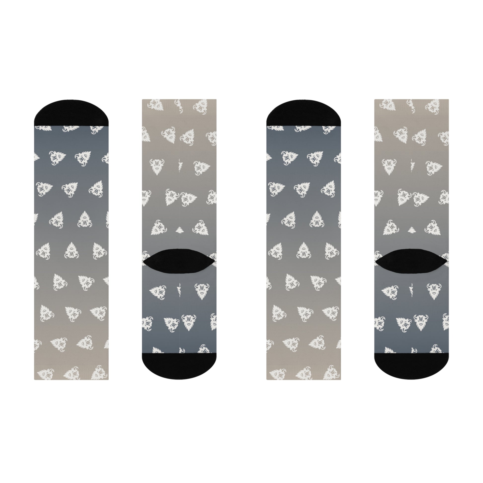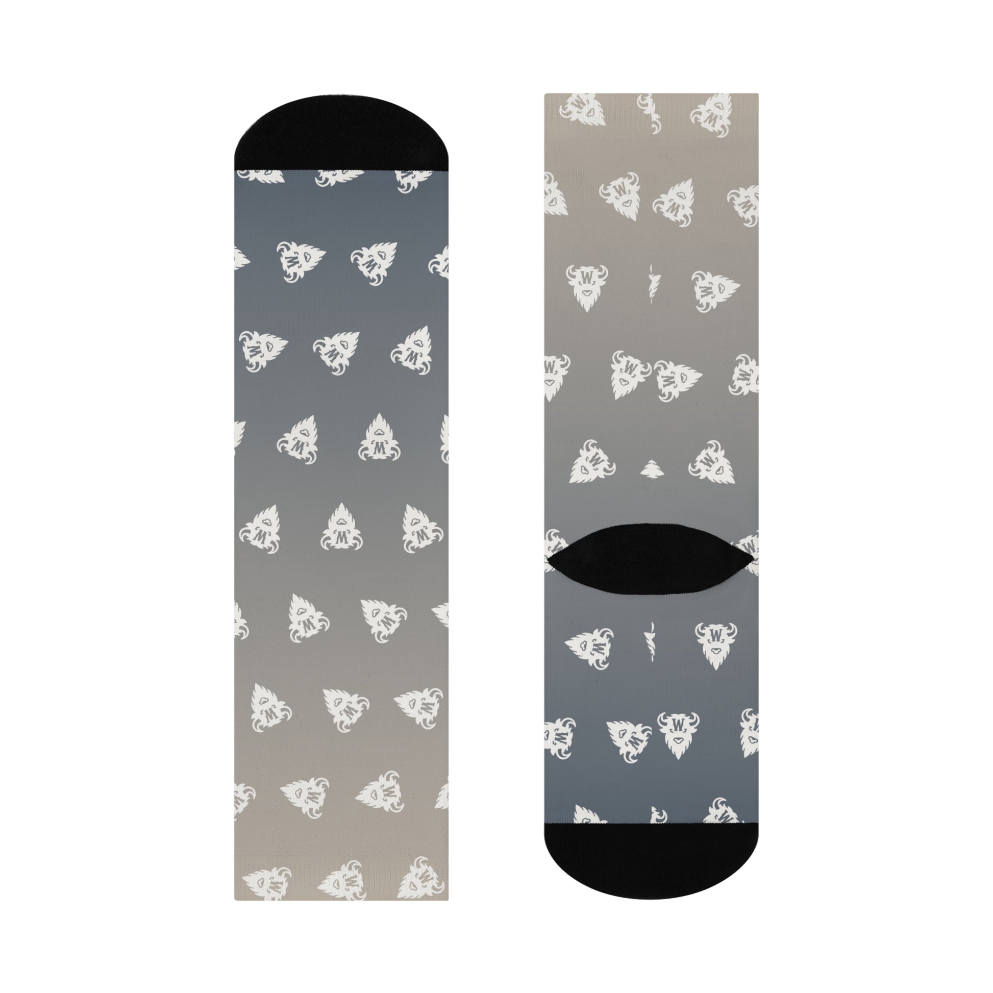 Rugged and refined, the Dust to Denim socks feature a smooth gradient from soft desert gray to classic denim blue. This cool-toned design brings everyday versatility with a western edge, wrapped in the signature Whayne Outfitters bison logo. Black heels and toes provide comfort and durability, whether you're kicking up trail dust or keeping it casual.
