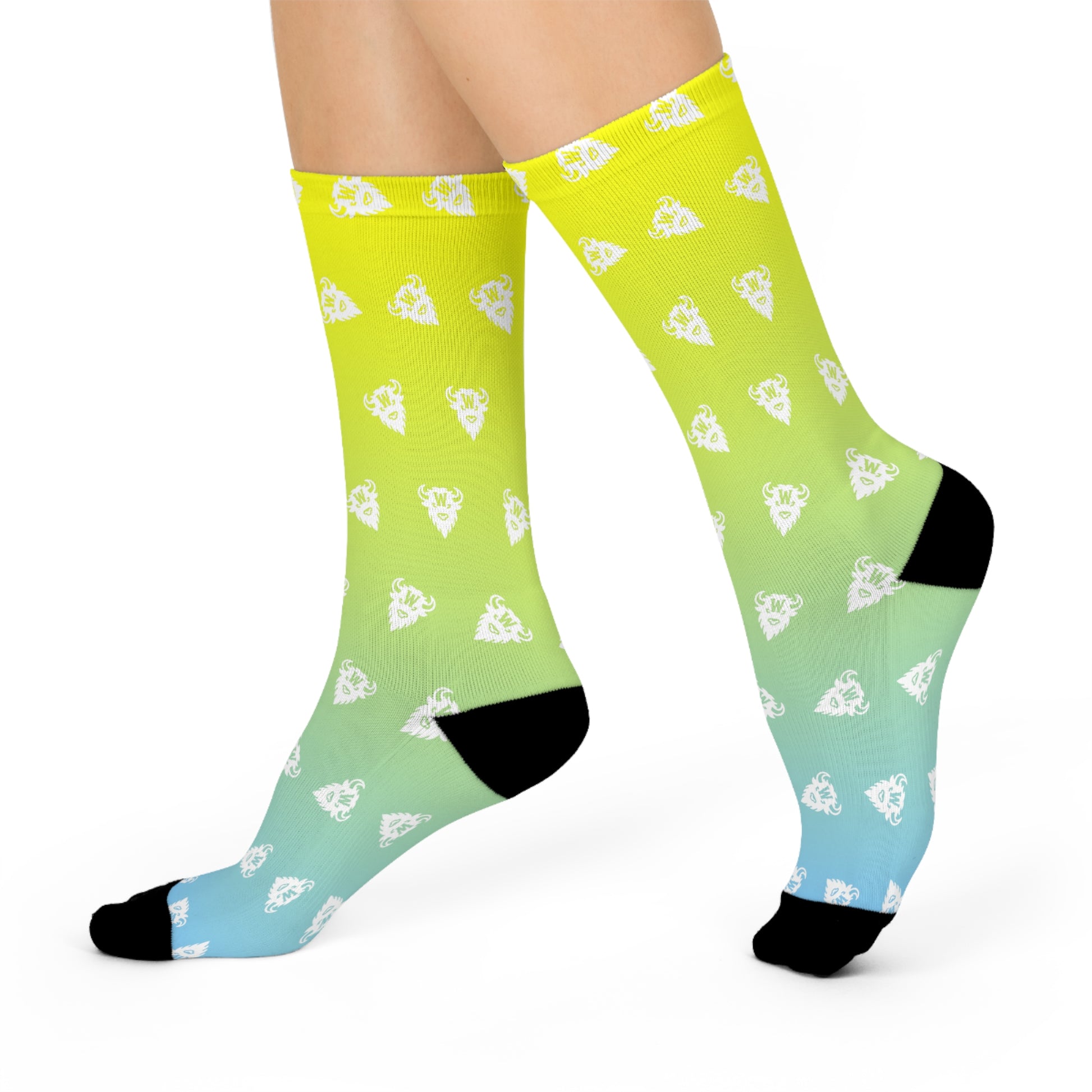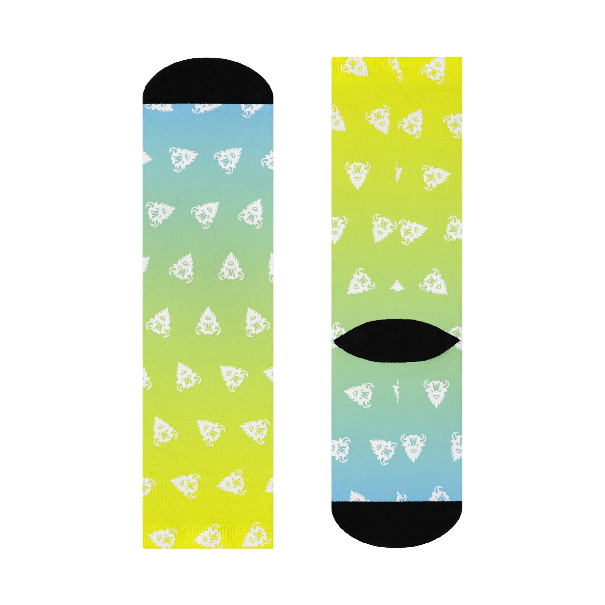 Channel the blazing energy of the midday sun with our High Noon Heat socks. This vibrant gradient flows from electric yellow into a cool desert sky blue, capturing that iconic Western heatwave. Adorned with the signature Whayne Outfitters bison logo, these socks deliver both style and substance. Finished with black heel and toe accents for added durability and a rugged edge.