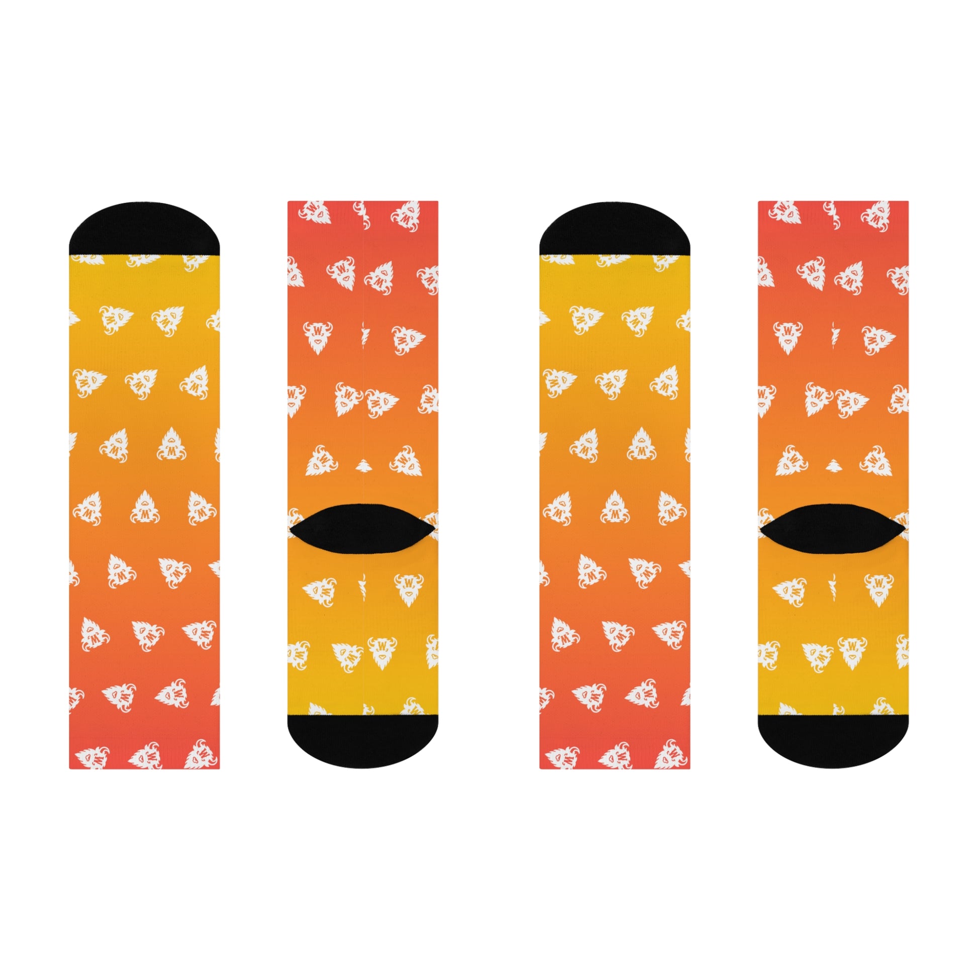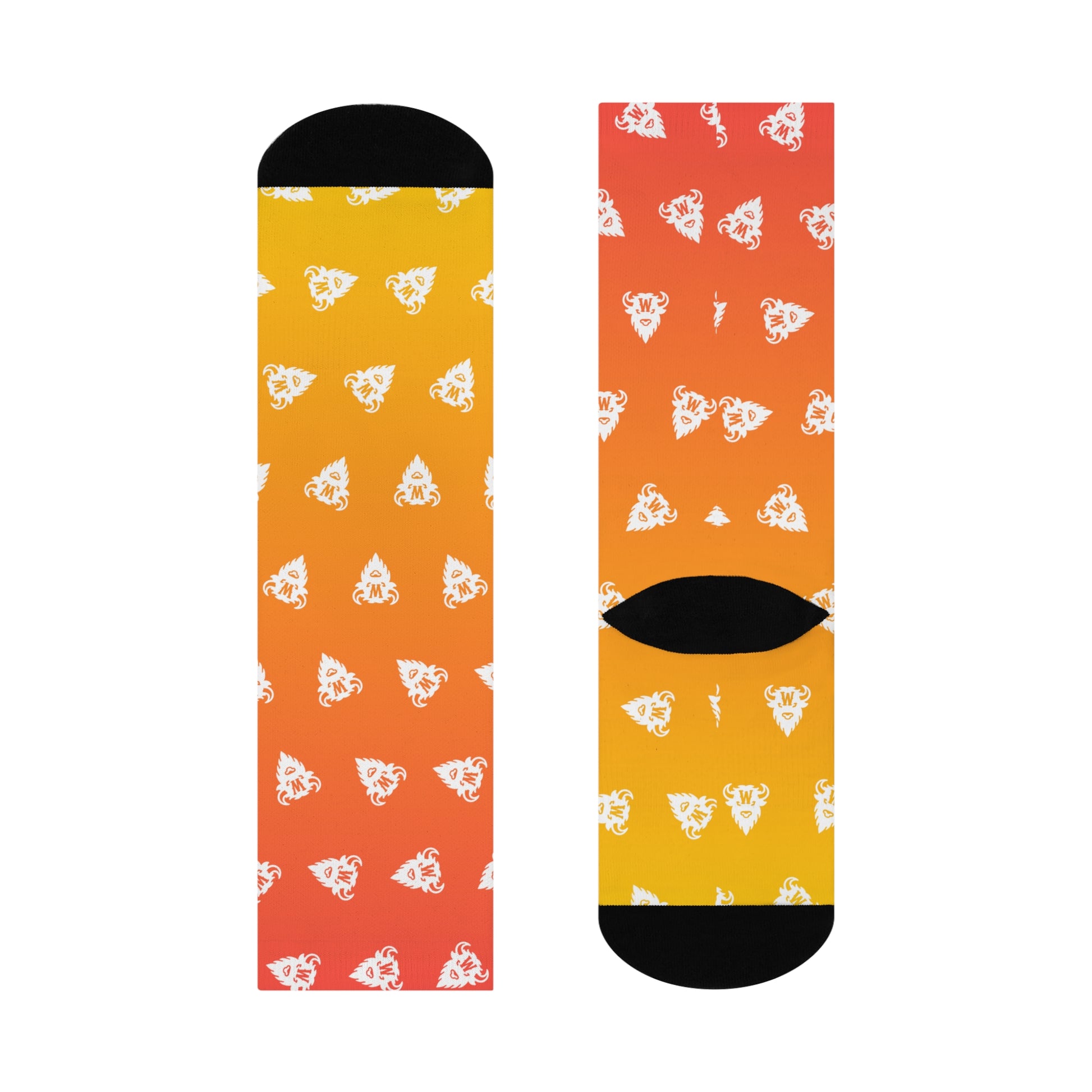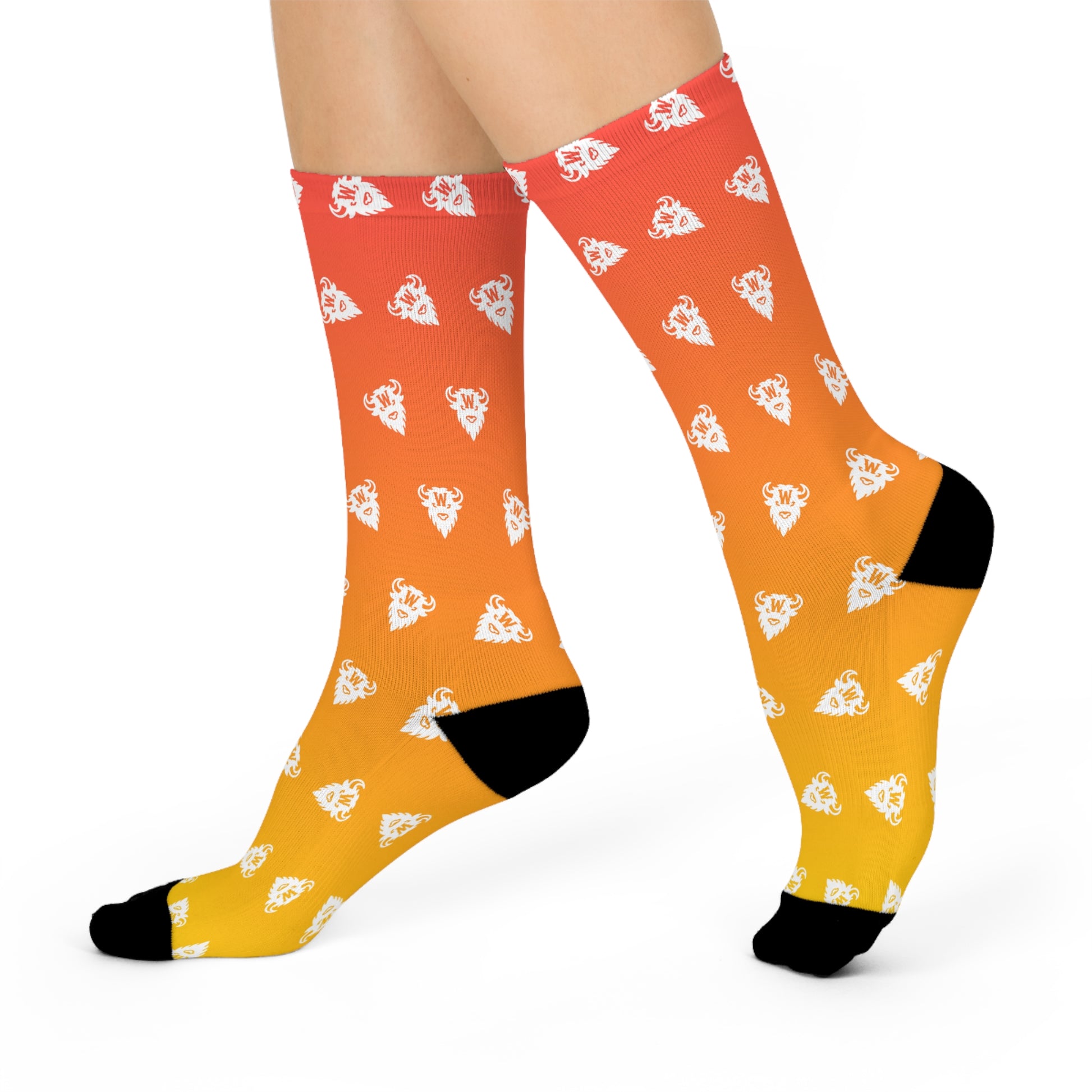 Inspired by golden desert evenings, our Saguaro Sunset socks fade from deep cactus orange to warm, sunlit yellow. Featuring a repeating pattern of the Whayne Outfitters bison logo, these socks are a bold statement of western spirit and style. The soft, breathable fabric and cushioned black heel and toe make them perfect for everyday wear—whether you're roaming the range or relaxing at home.