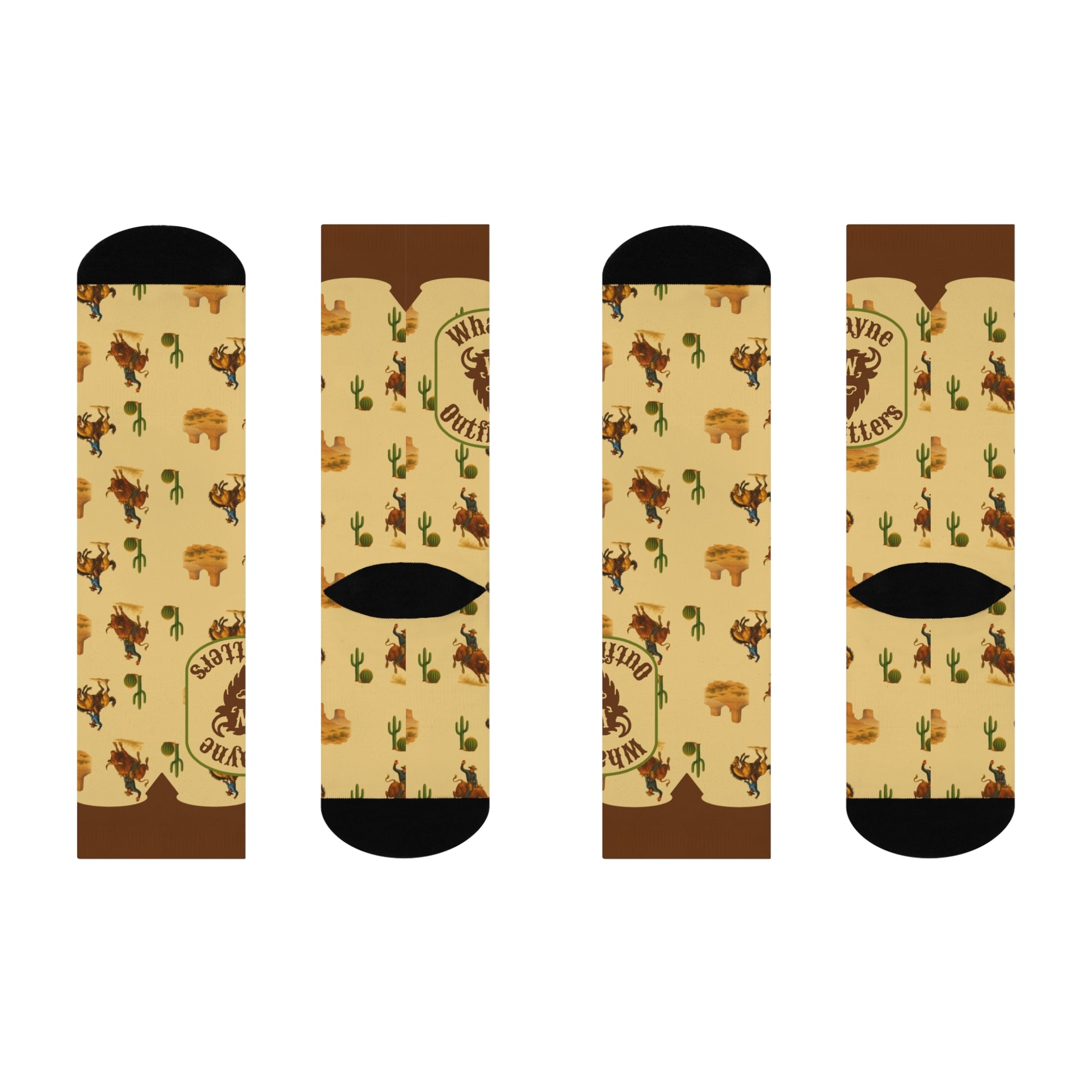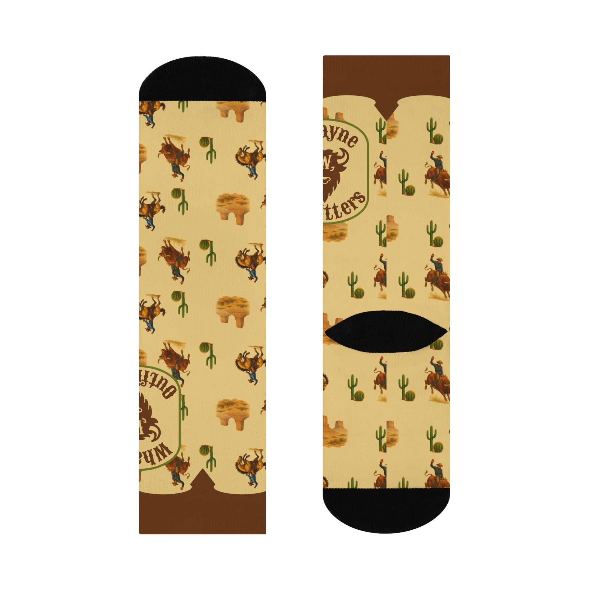 Saddle up with our Desert Rodeo Crew Socks, where wild riders, towering mesas, and scattered cacti come together on a dusty tan backdrop. Featuring bold cowboy action scenes and the classic Whayne Outfitters badge on the side, these socks are made for the ones who ride hard, rope fast, and live free under the desert sun.