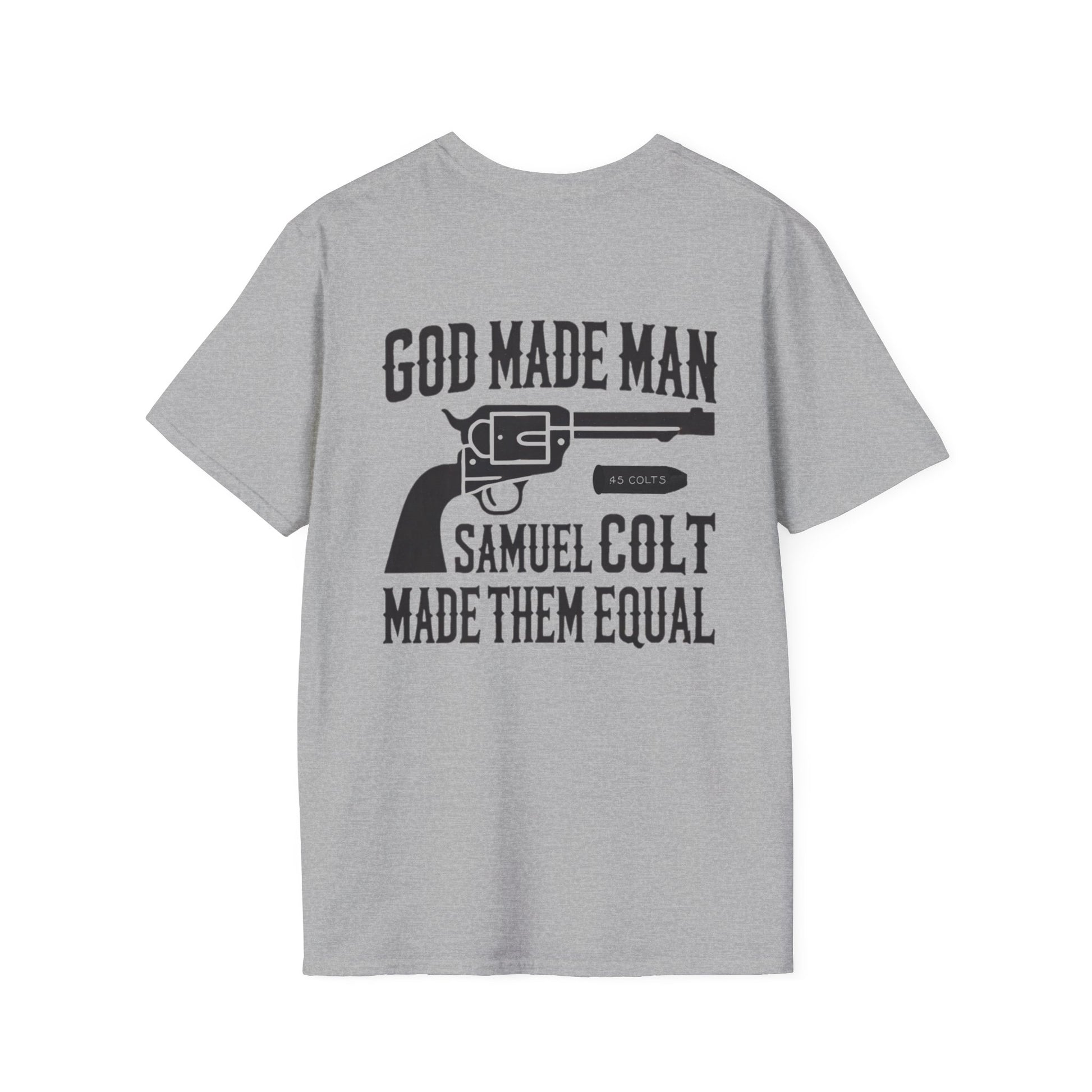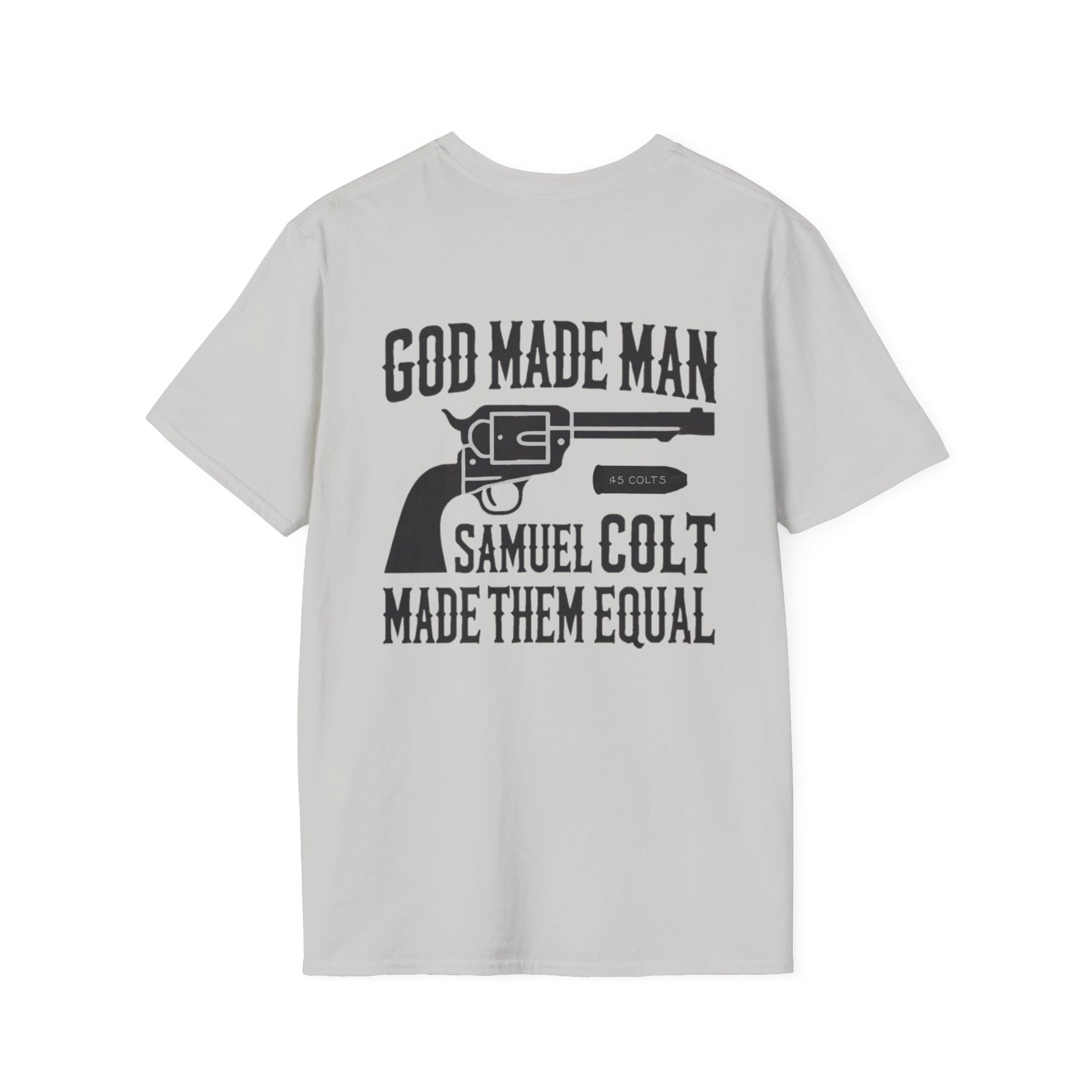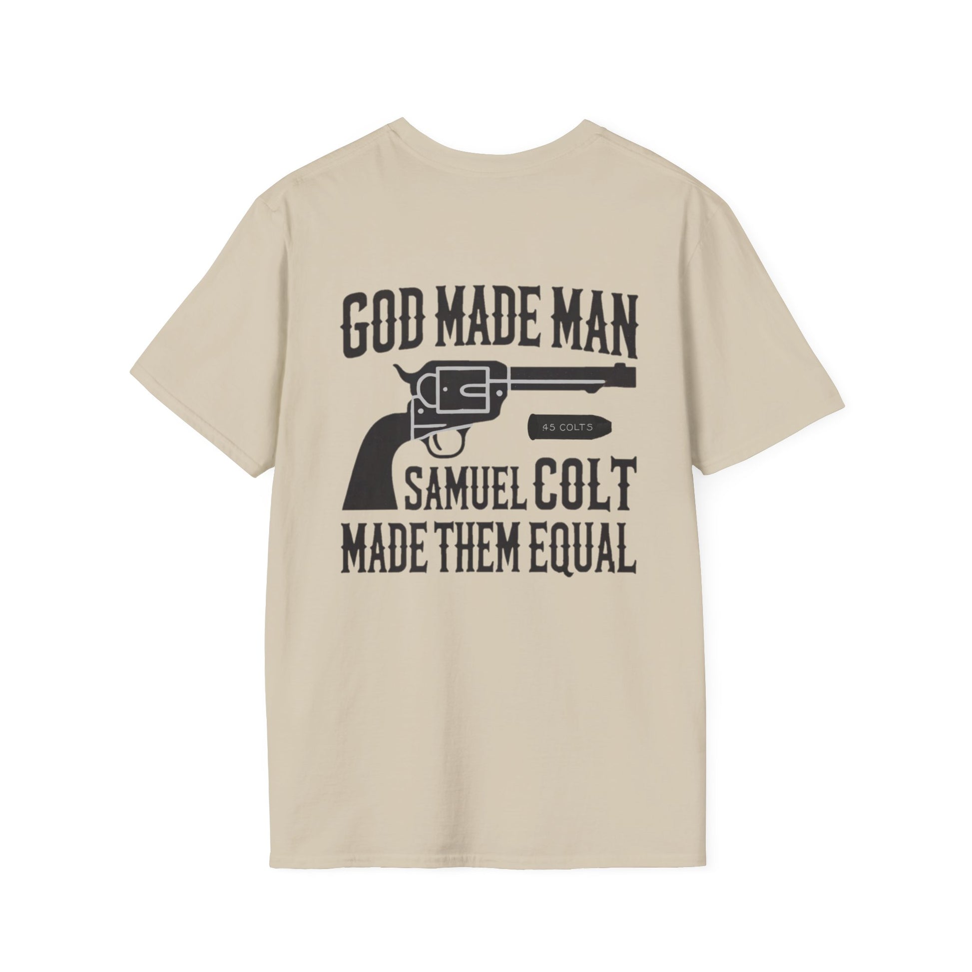 A classic statement that echoes through the Old West—“God made man, Samuel Colt made them equal.” Featuring a vintage-style revolver graphic paired with bold, frontier-era typography, this design pays homage to one of the most iconic tools of the American frontier. Rugged, unapologetic, and rooted in Western heritage, this tee is for those who appreciate grit, history, and straight-shooting style.