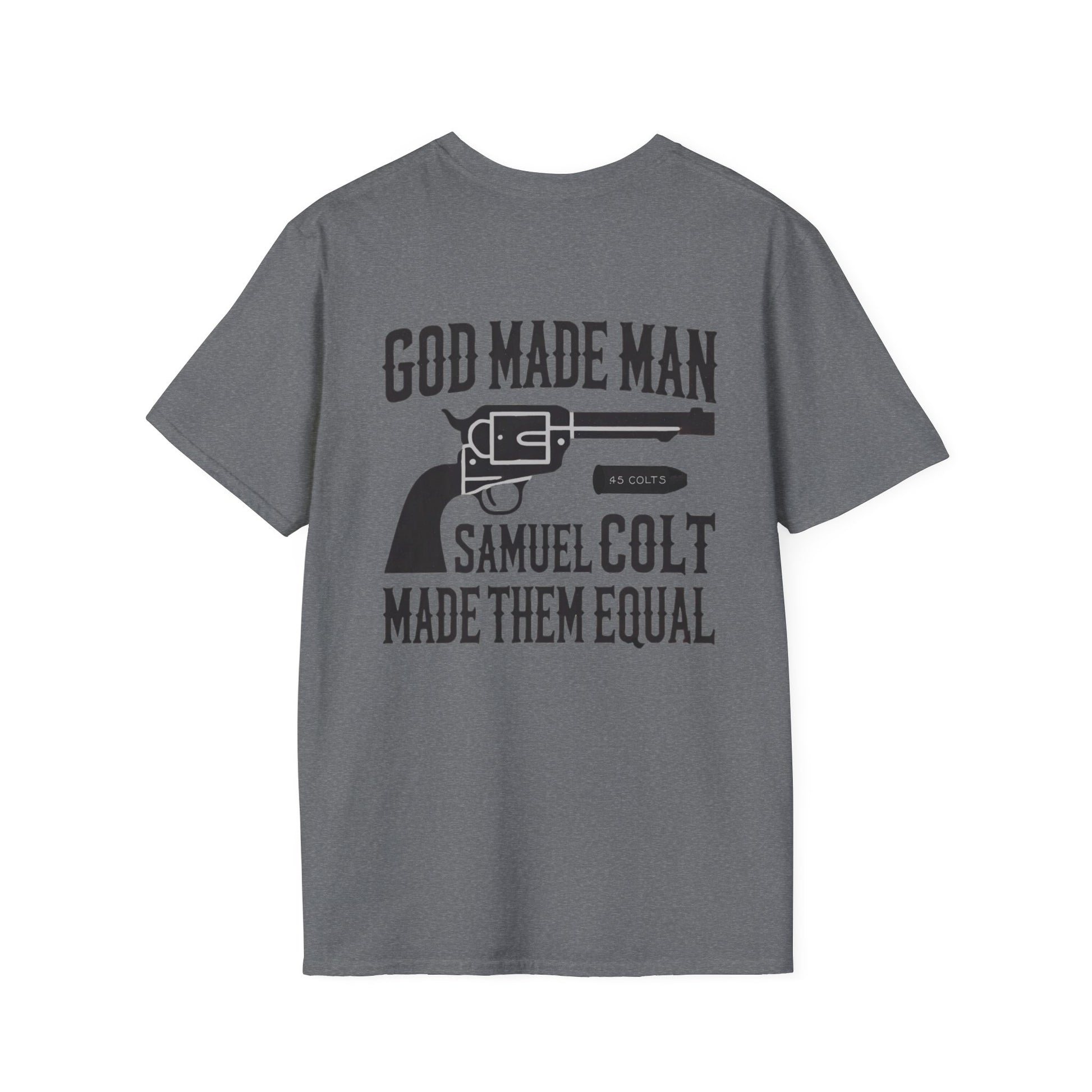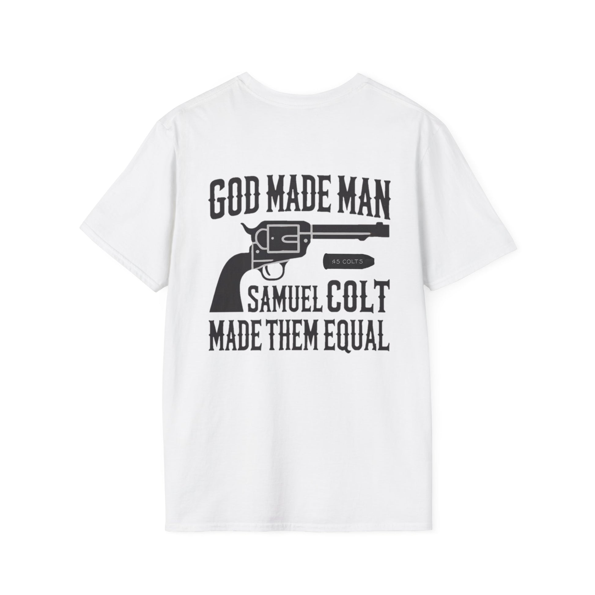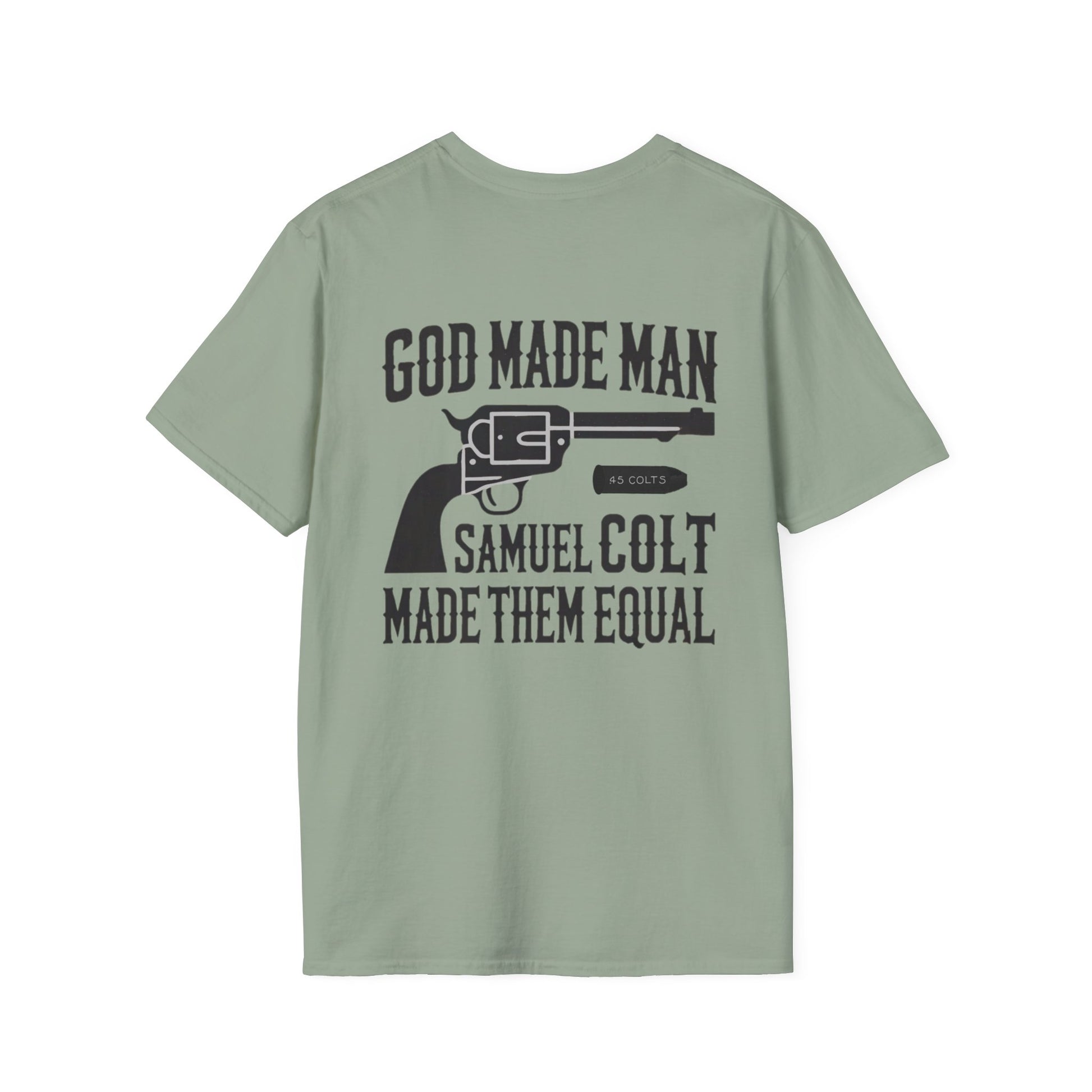 A classic statement that echoes through the Old West—“God made man, Samuel Colt made them equal.” Featuring a vintage-style revolver graphic paired with bold, frontier-era typography, this design pays homage to one of the most iconic tools of the American frontier. Rugged, unapologetic, and rooted in Western heritage, this tee is for those who appreciate grit, history, and straight-shooting style.