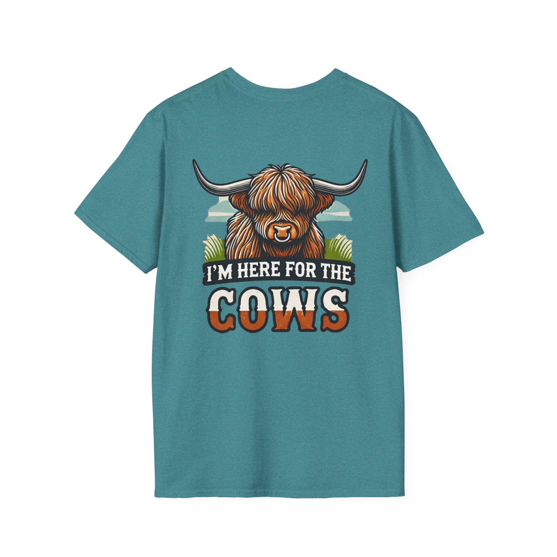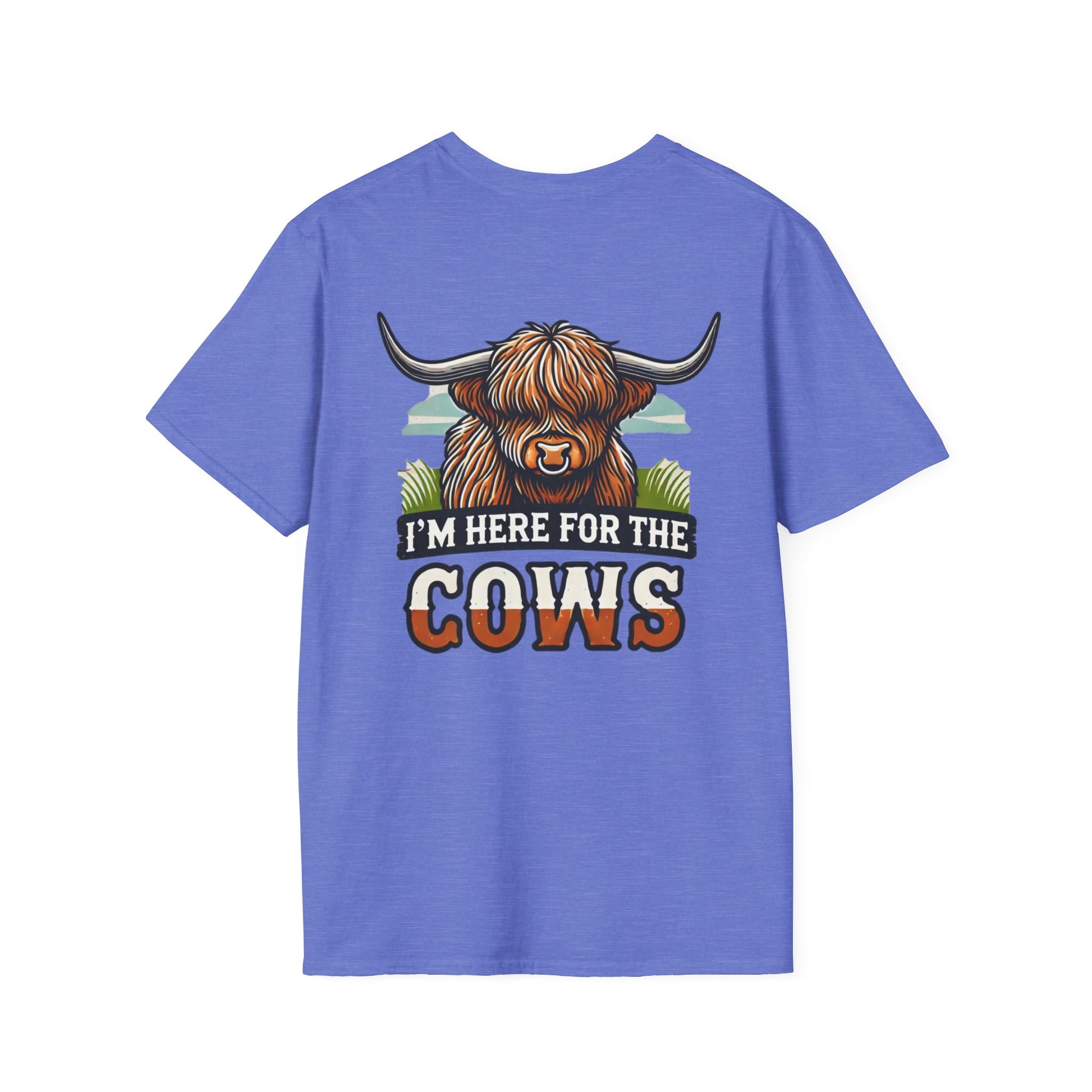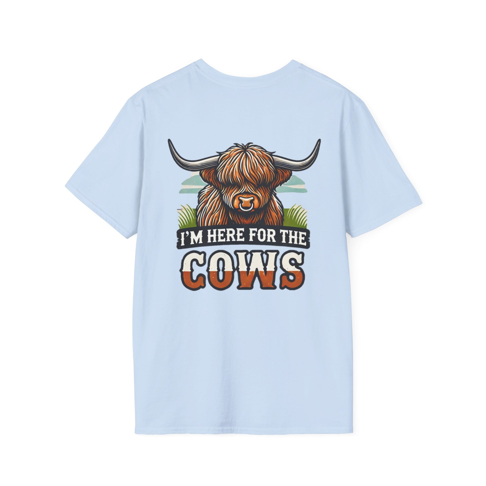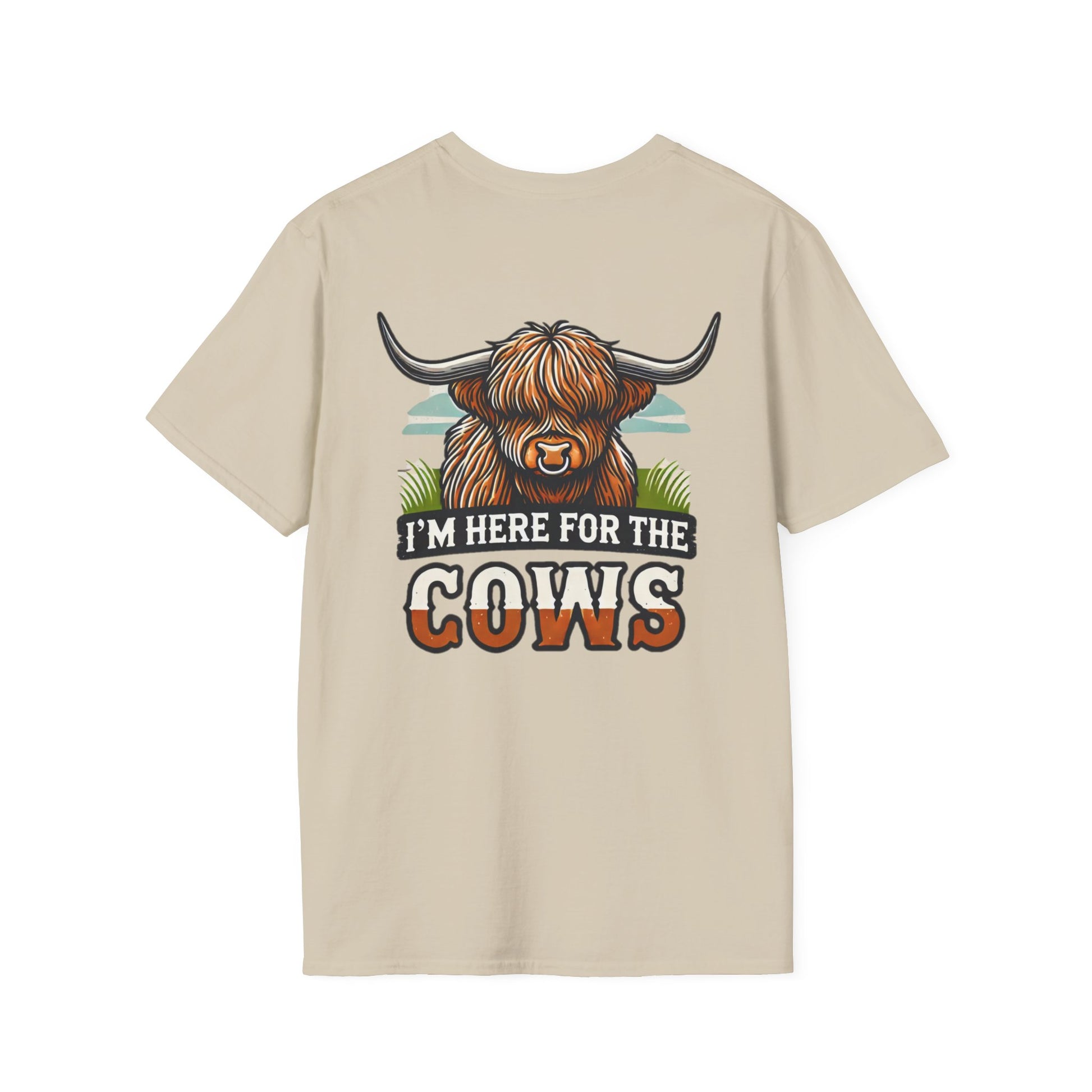 Bright, bold, and just a little bit ridiculous—this I’m Here for the Cows tee features a charming cartoon-style Highland cow with a shaggy mane and a whole lot of personality. Set against a cheerful backdrop of rolling grass and sky stripes, this version leans into fun, approachable farm-life energy with a western twist.