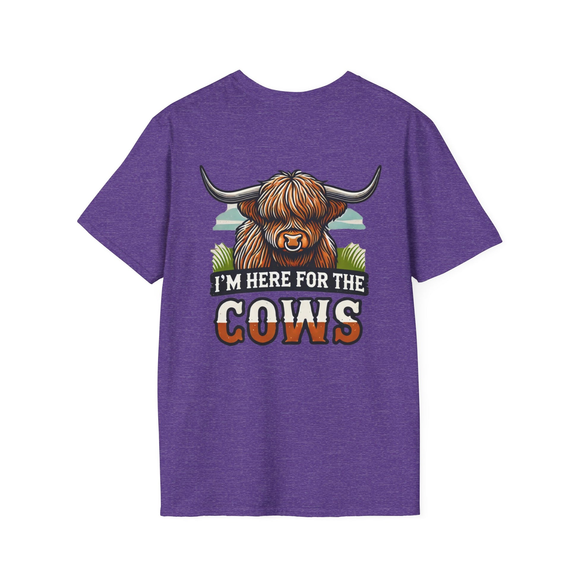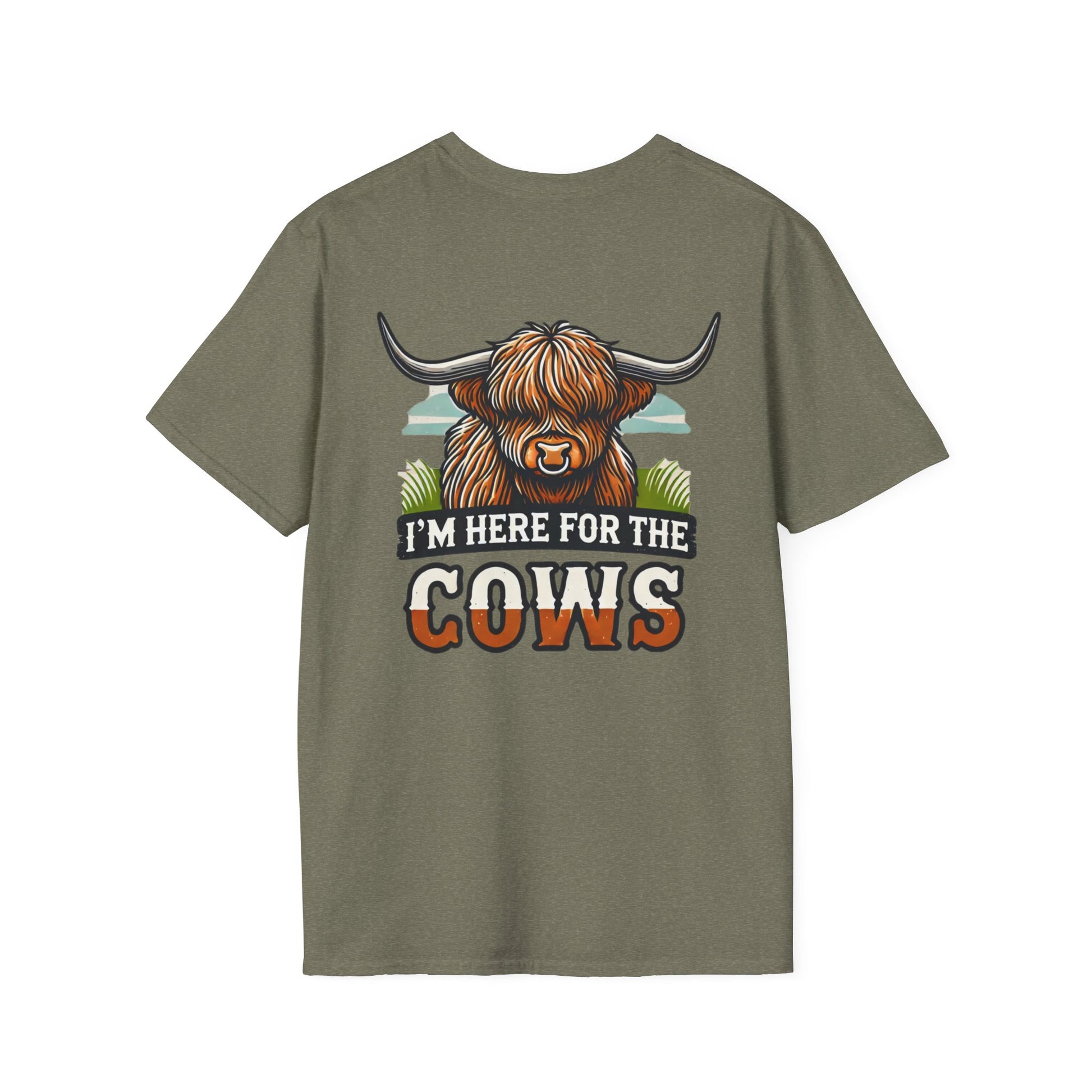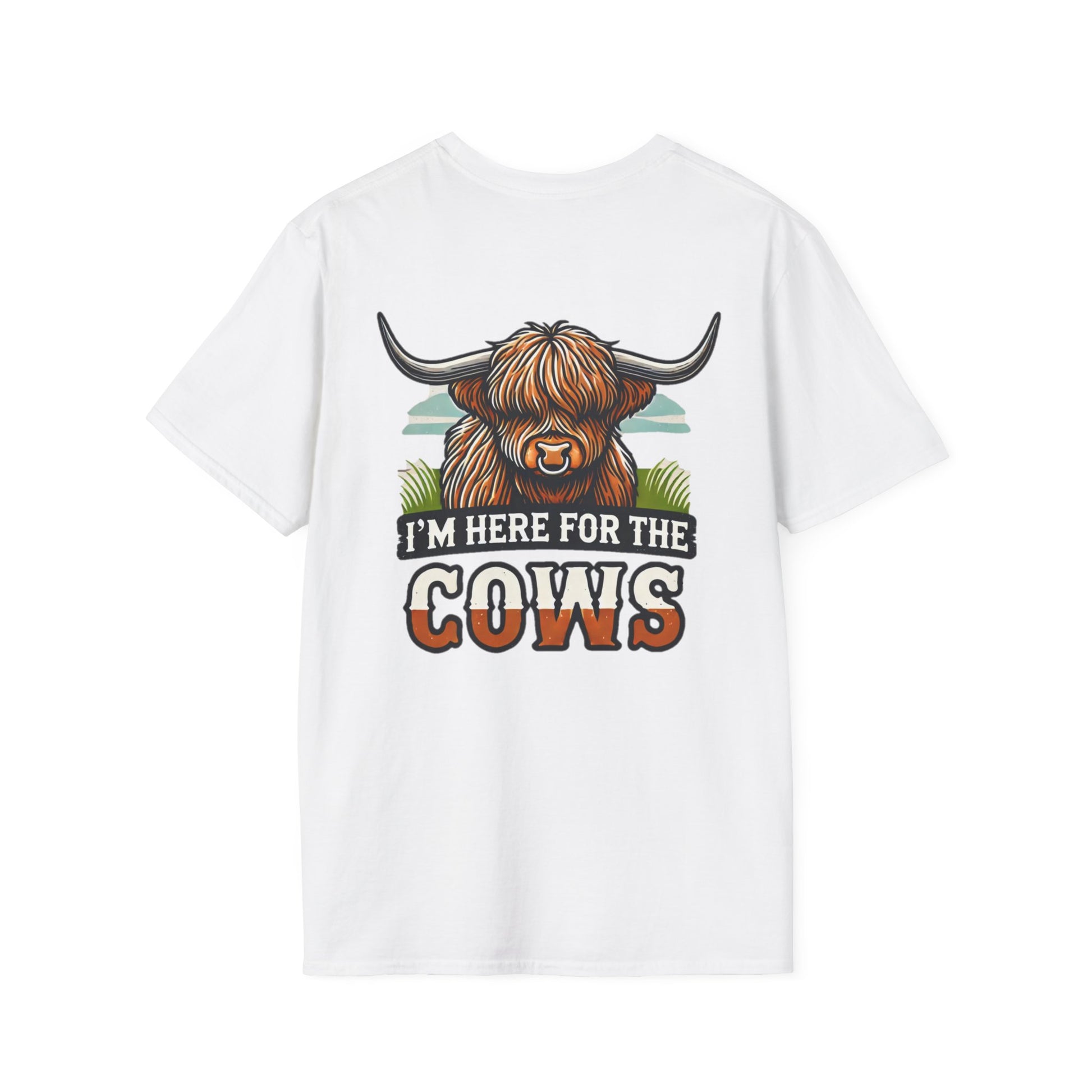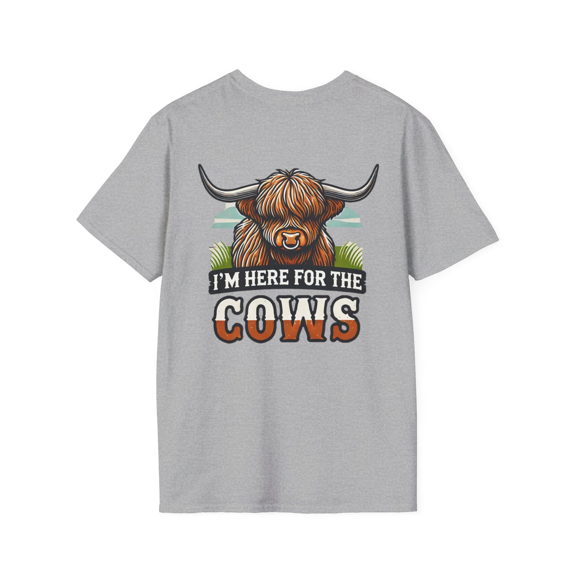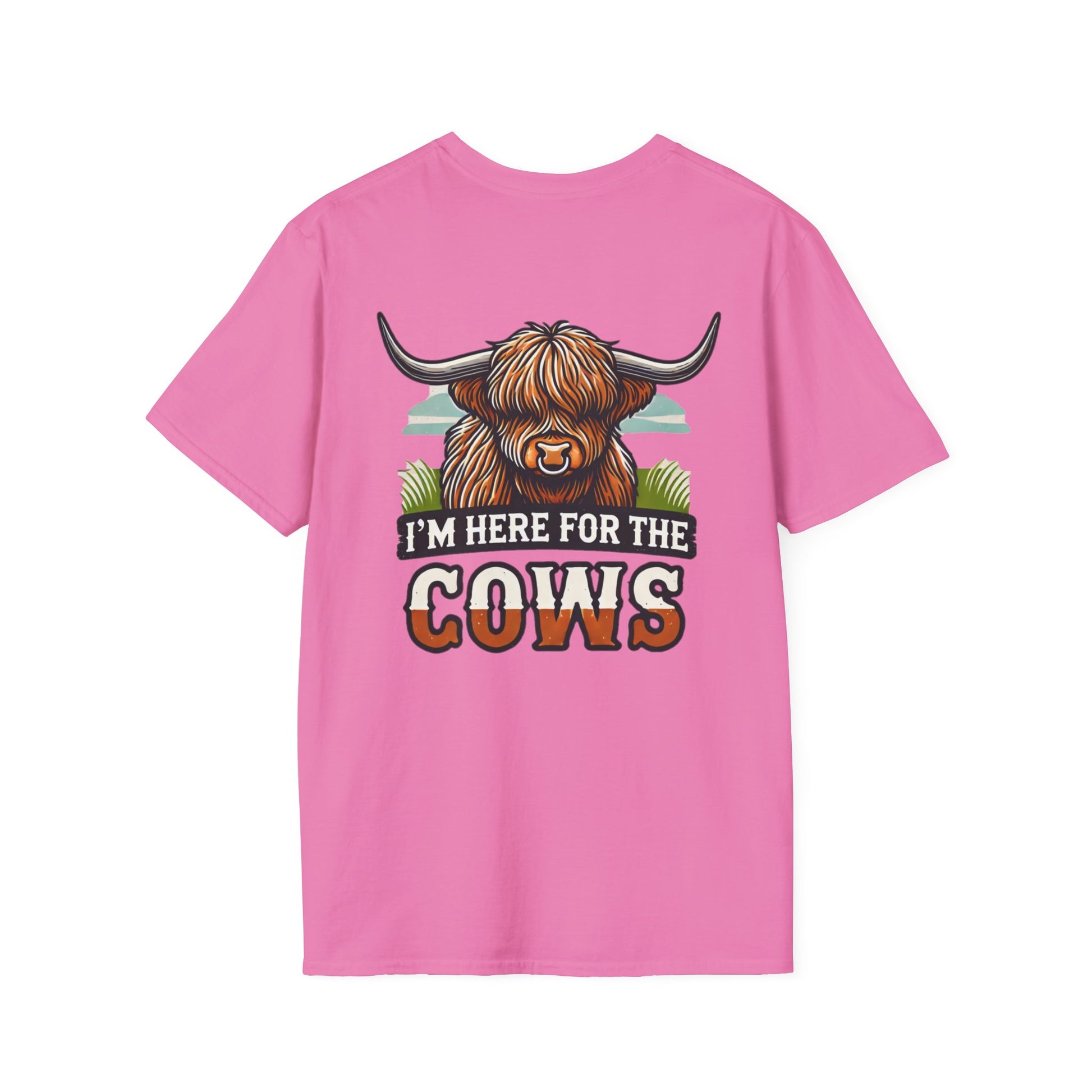 Bright, bold, and just a little bit ridiculous—this I’m Here for the Cows tee features a charming cartoon-style Highland cow with a shaggy mane and a whole lot of personality. Set against a cheerful backdrop of rolling grass and sky stripes, this version leans into fun, approachable farm-life energy with a western twist.