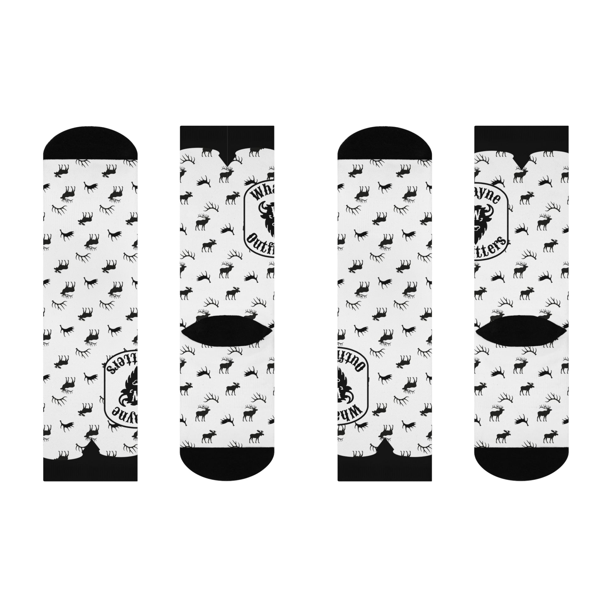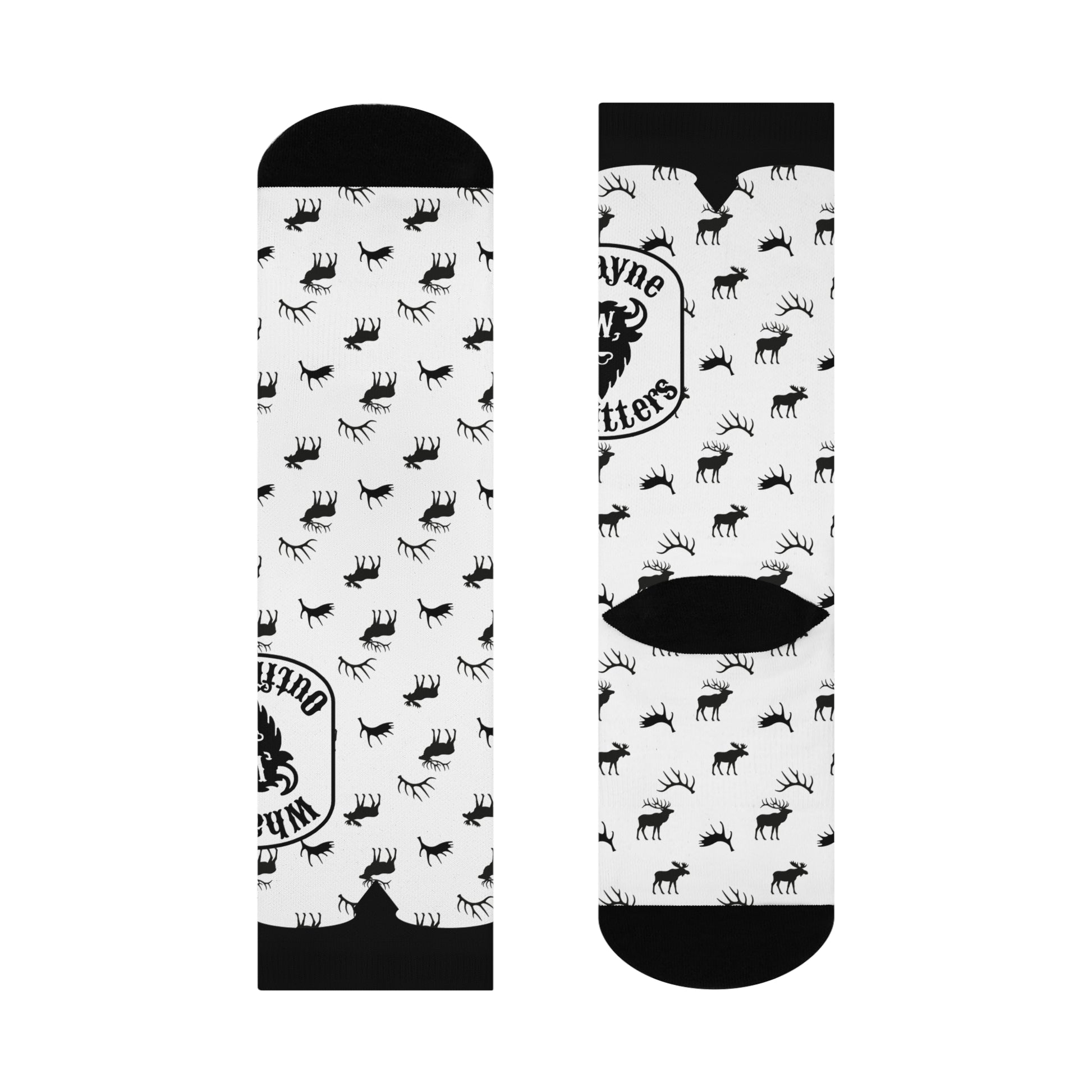 Step into the wild with our Mountain Moose & Elk Crew Socks. Featuring a bold black-and-white pattern of antlered silhouettes—both moose and elk—these socks capture the essence of rugged alpine terrain and untamed wilderness. A subtle mountain range wraps the top, while “Whayne Outfitters” branding on the toe ties it all together in rustic, frontier style.