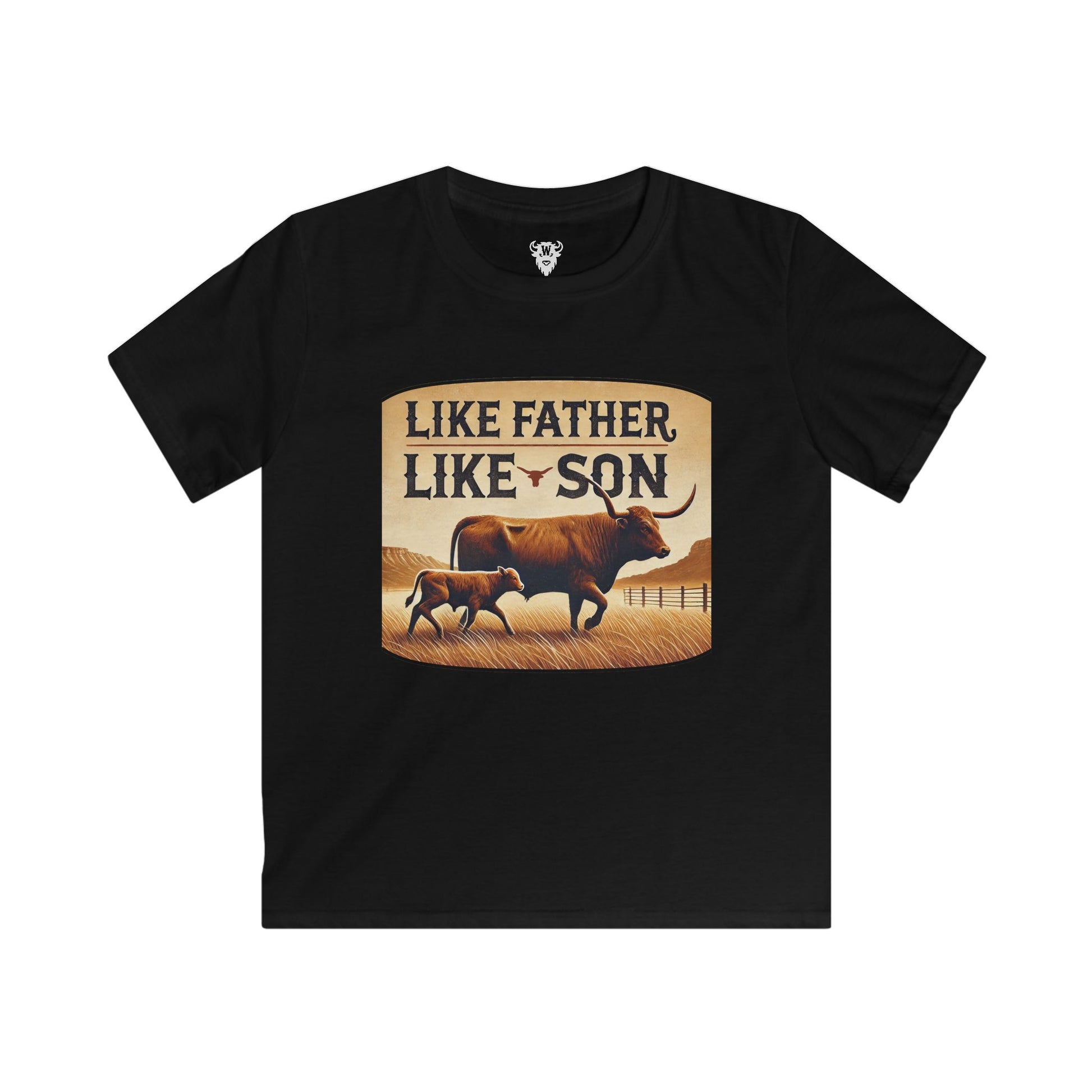 Just like Dad—only shorter. This heartwarming design features a calf trailing its longhorn father across open prairie with bold Like Father Like Son lettering up top. It’s a tribute to tradition, family, and the little ones learning to walk the same proud path.