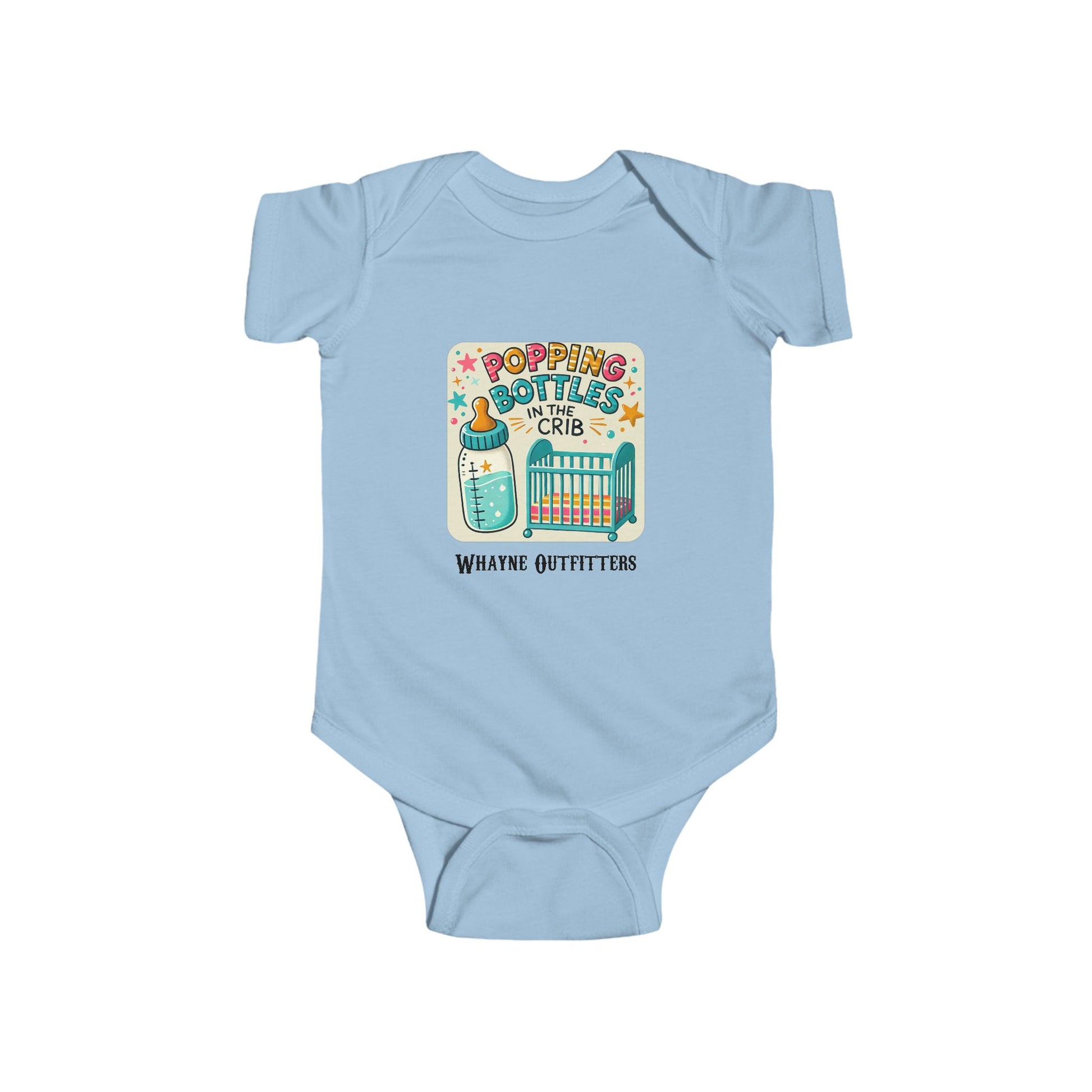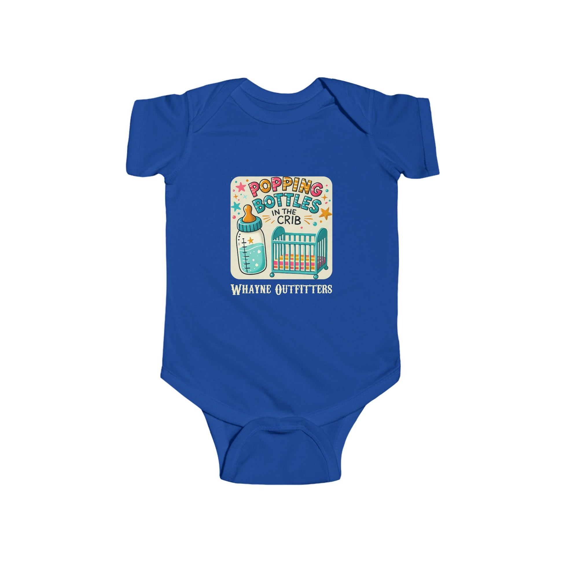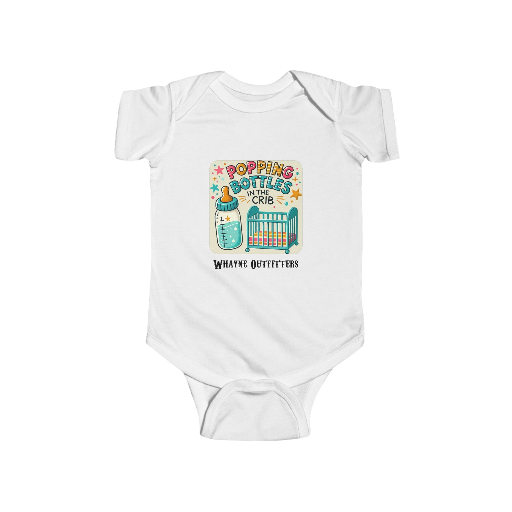 Crib party? Yeah, they're invited. The Poppin' Bottles in the Crib Baby Bodysuit brings the laughs with its playful bottle-and-crib graphic and Whayne Outfitters twist. Bright colors, sparkles, and bold text make this onesie a standout choice for the littlest VIP in the nursery scene.