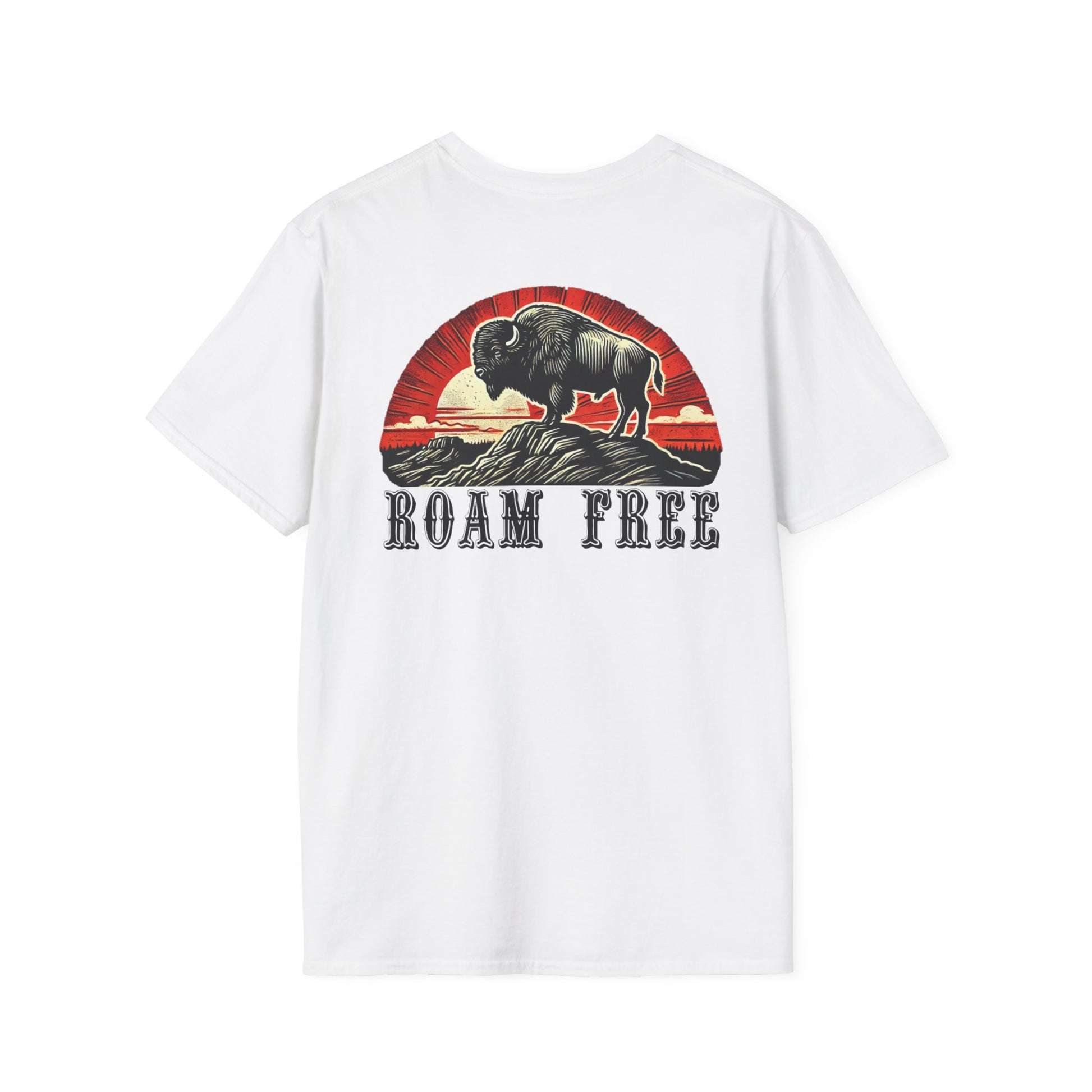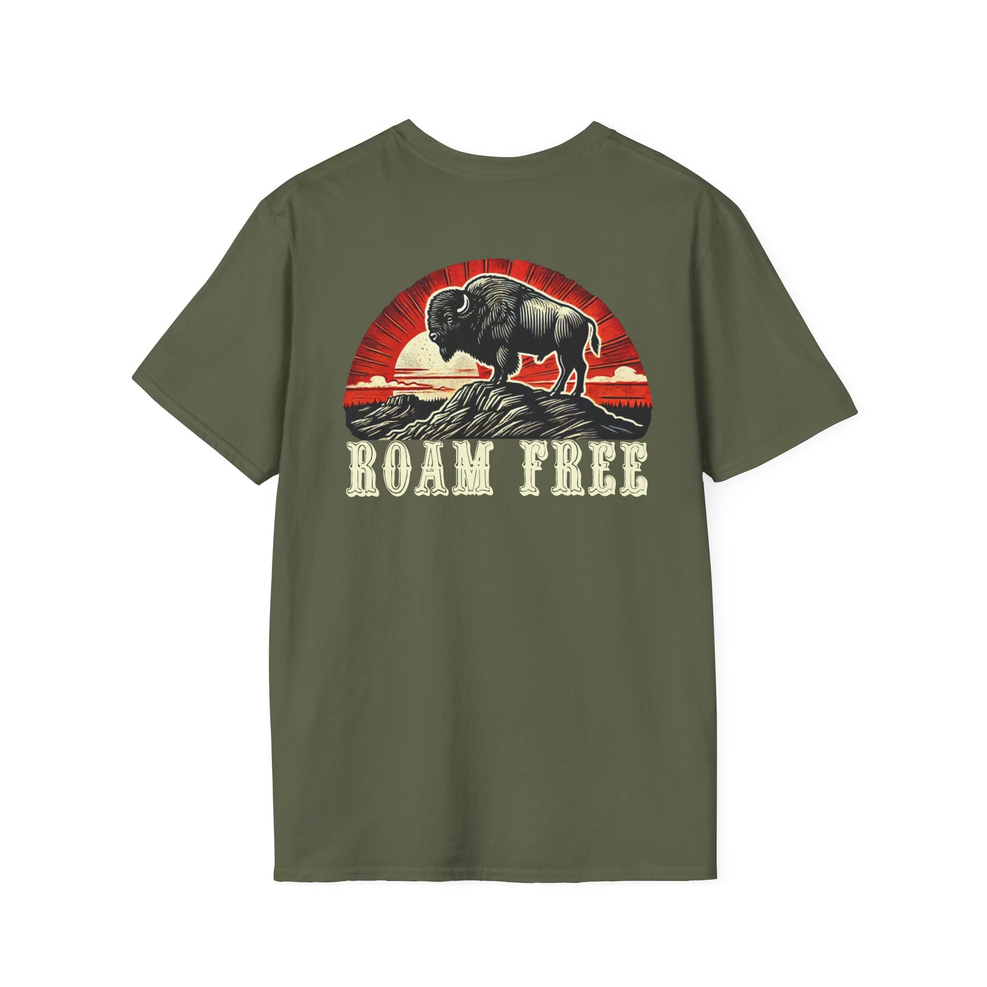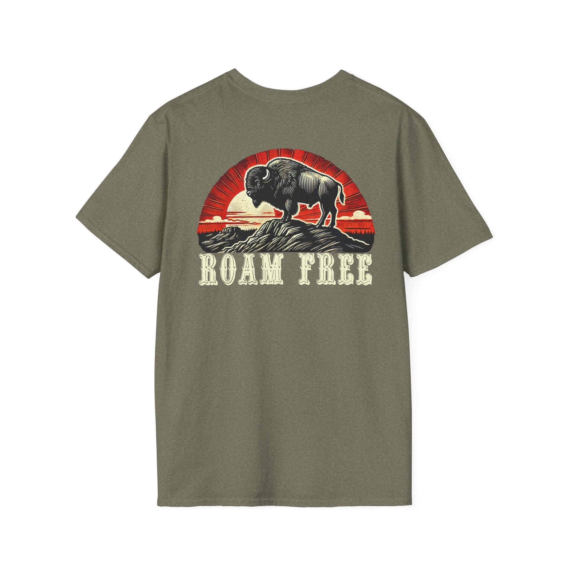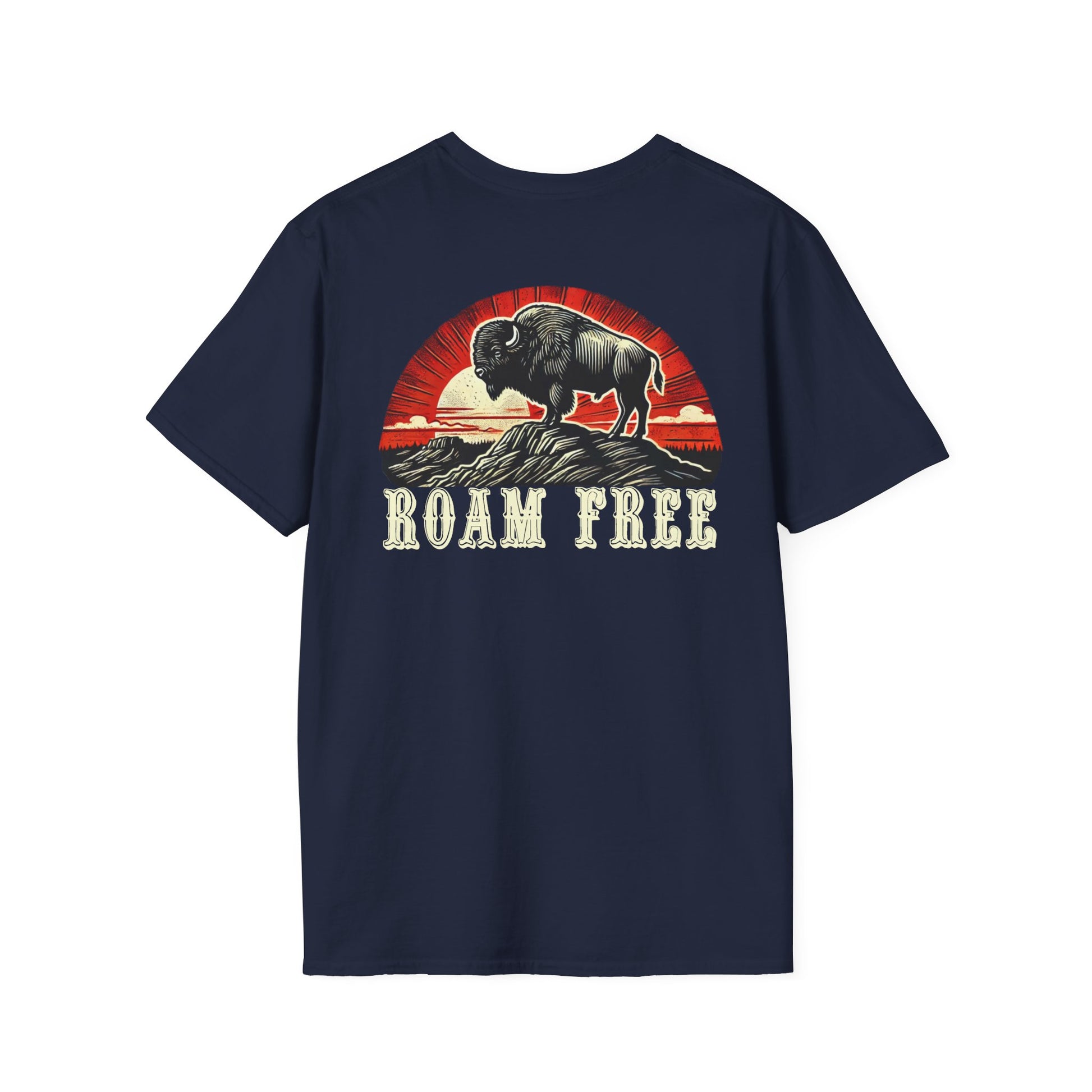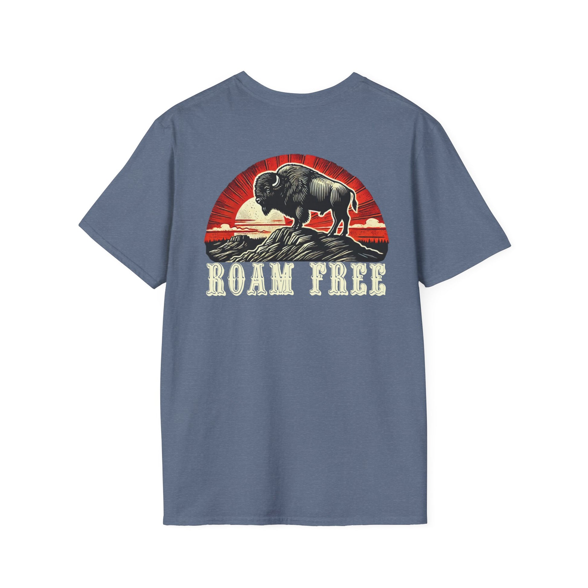 The spirit of the plains doesn’t sleep—it blazes across the horizon. The Roam Free – Sunset Edition tee features a mighty bison standing tall against a vivid red-and-orange western sunset. With a rugged landscape at its feet and the phrase “Roam Free” stamped in vintage lettering, this design is a visual anthem of strength and freedom.