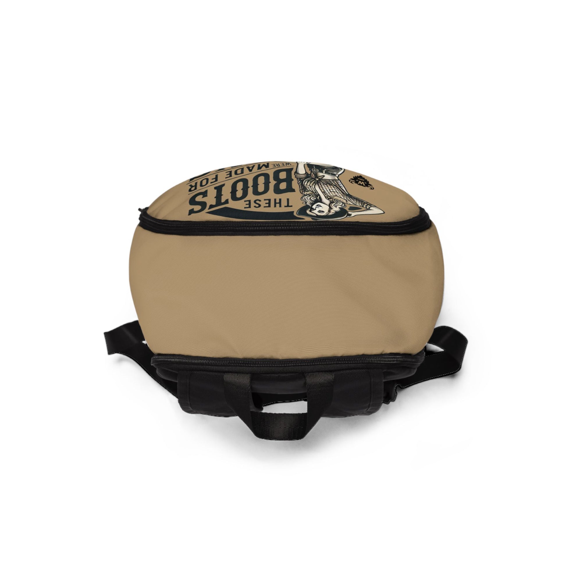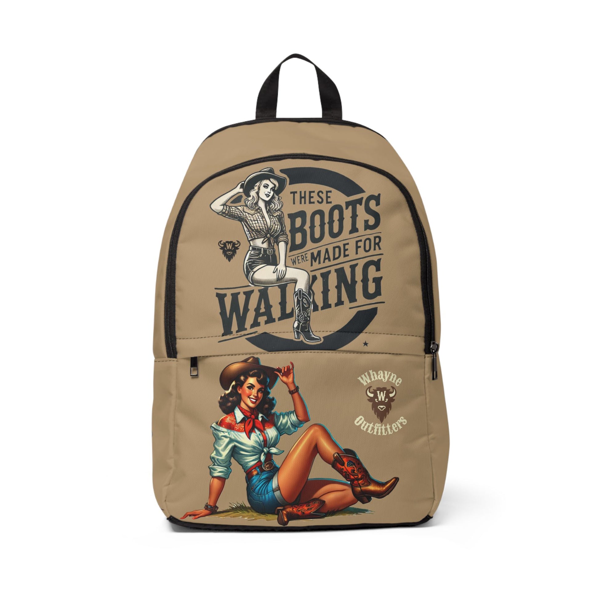 Turn heads in the hallways, on campus, or at the rodeo with our “These Boots Were Made for Walking” backpack – where sass meets style. This bold tan backpack features vintage cowgirl pin-up art paired with classic western charm, making it the perfect statement piece for everyday carry.