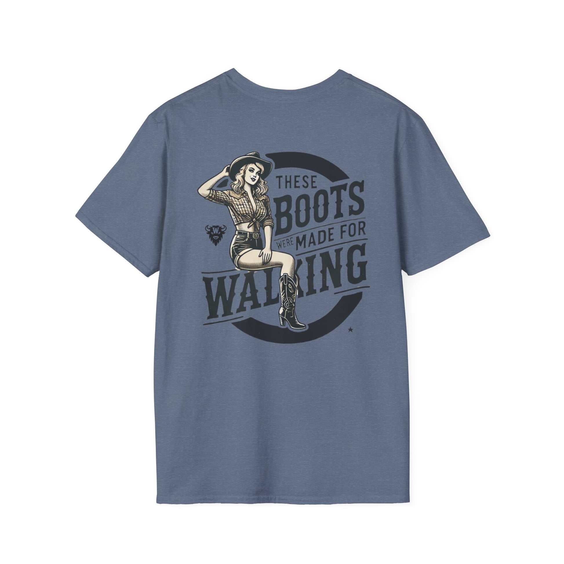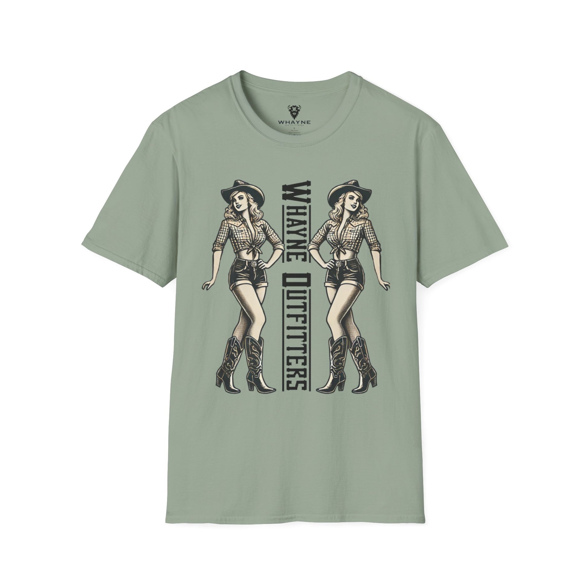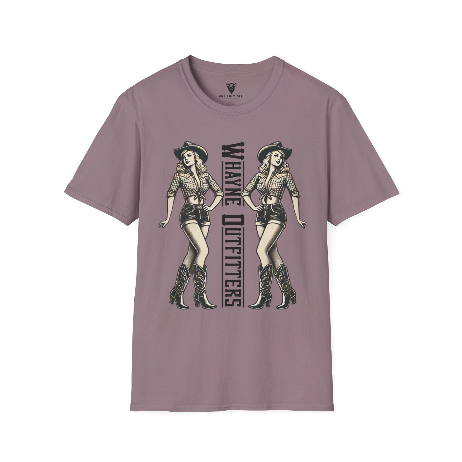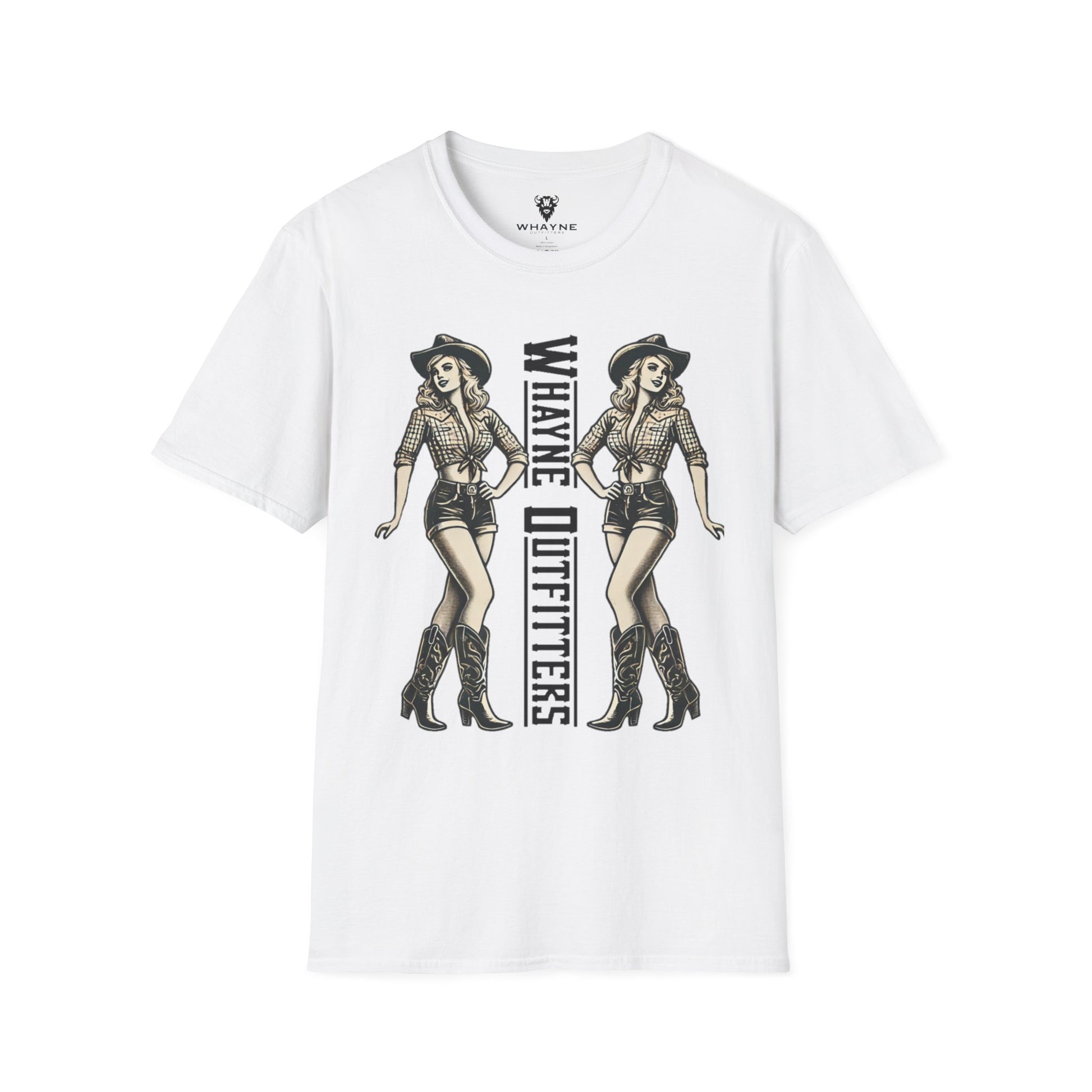 Turn heads, kick dust, and strut proud—because these boots were made for walking. This bold double-sided tee features a vintage-style cowgirl pin-up in boots, shorts, and attitude to spare. The back says it loud with “These Boots Were Made for Walking,” while the front doubles down with mirrored cowgirl illustrations flanking the Whayne Outfitters name.