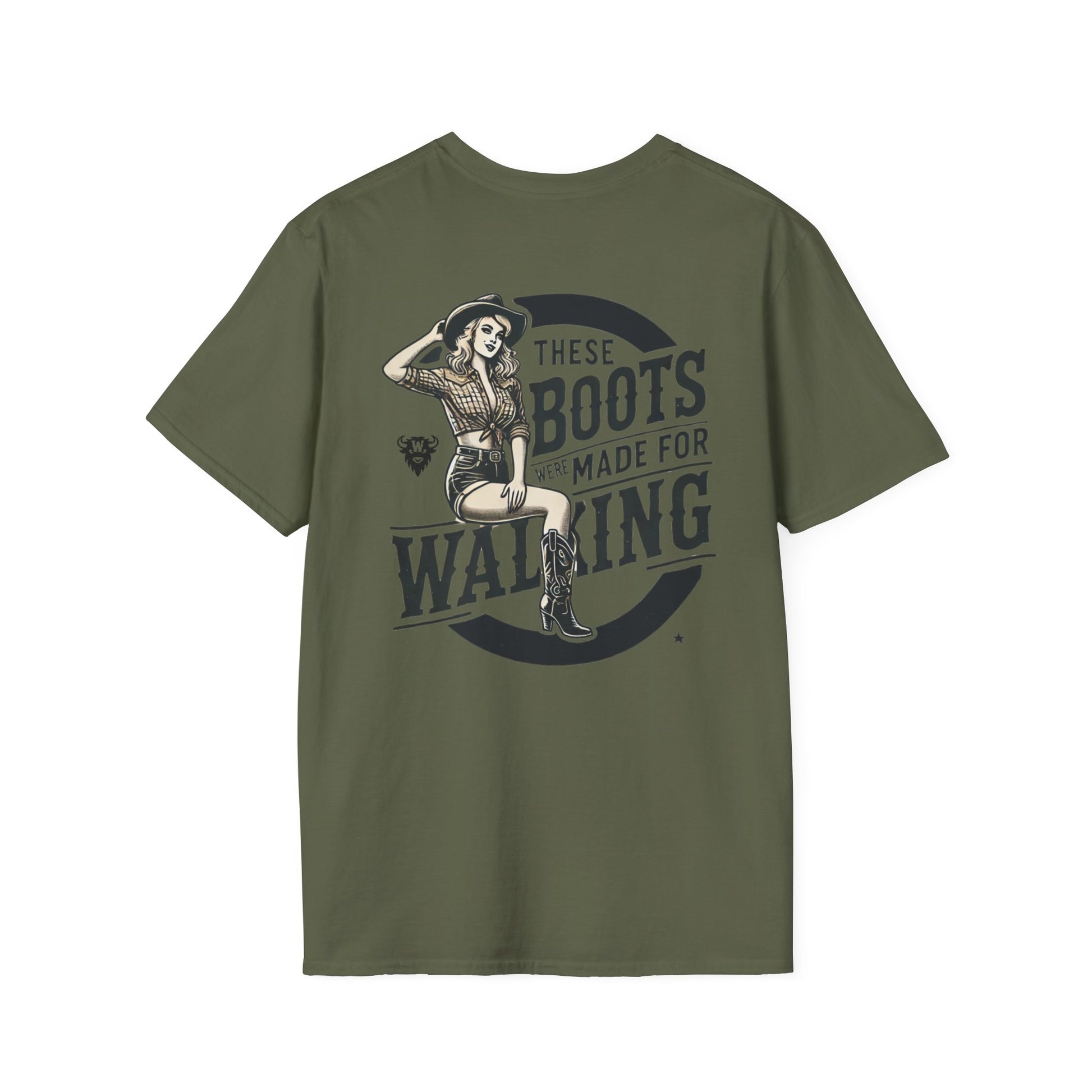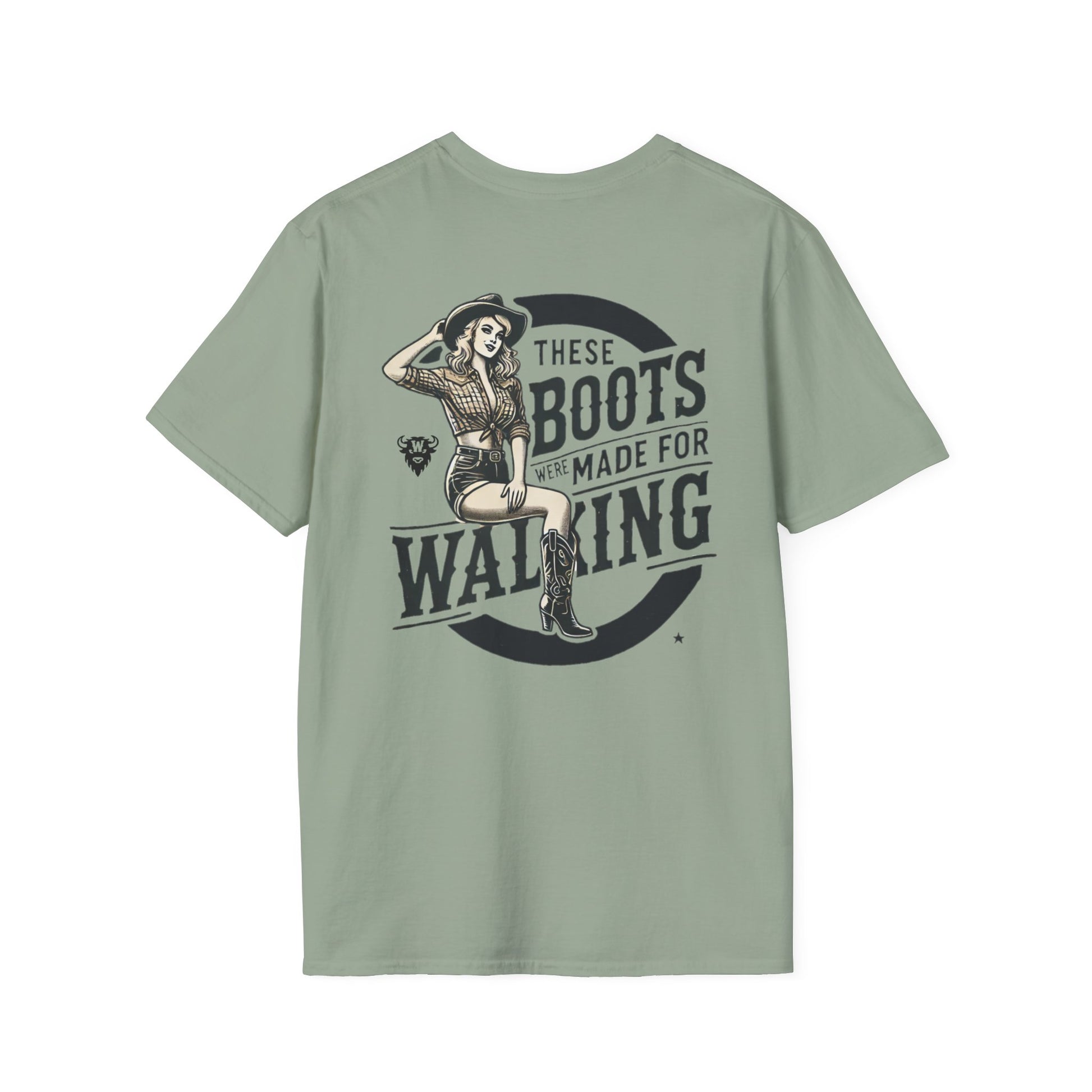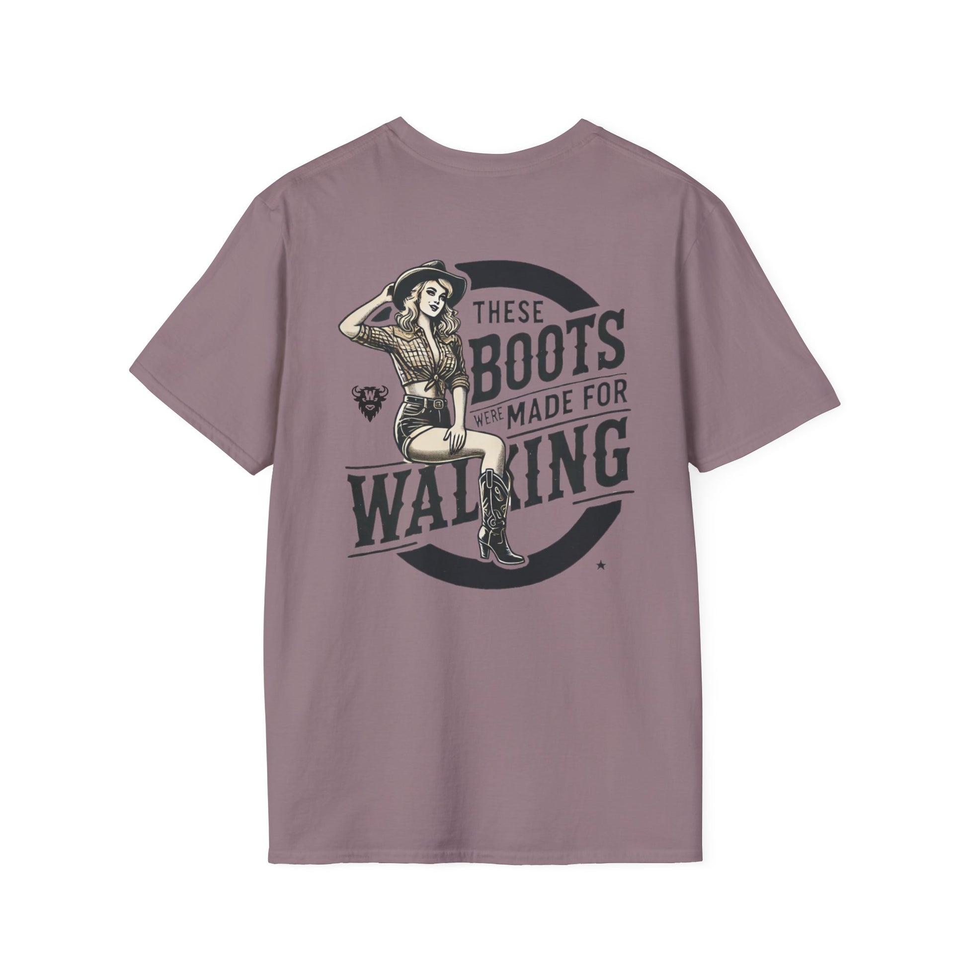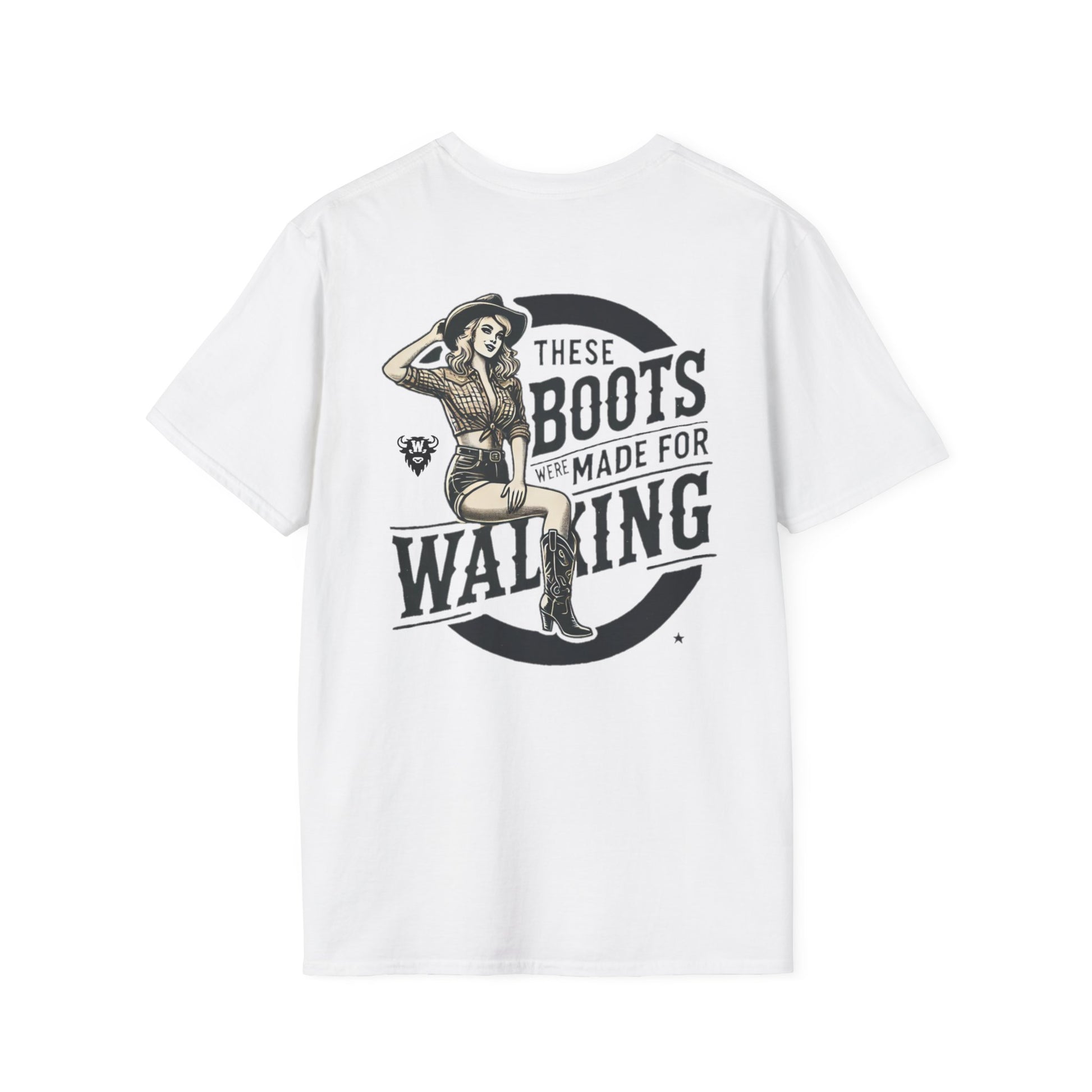 Turn heads, kick dust, and strut proud—because these boots were made for walking. This bold double-sided tee features a vintage-style cowgirl pin-up in boots, shorts, and attitude to spare. The back says it loud with “These Boots Were Made for Walking,” while the front doubles down with mirrored cowgirl illustrations flanking the Whayne Outfitters name.
