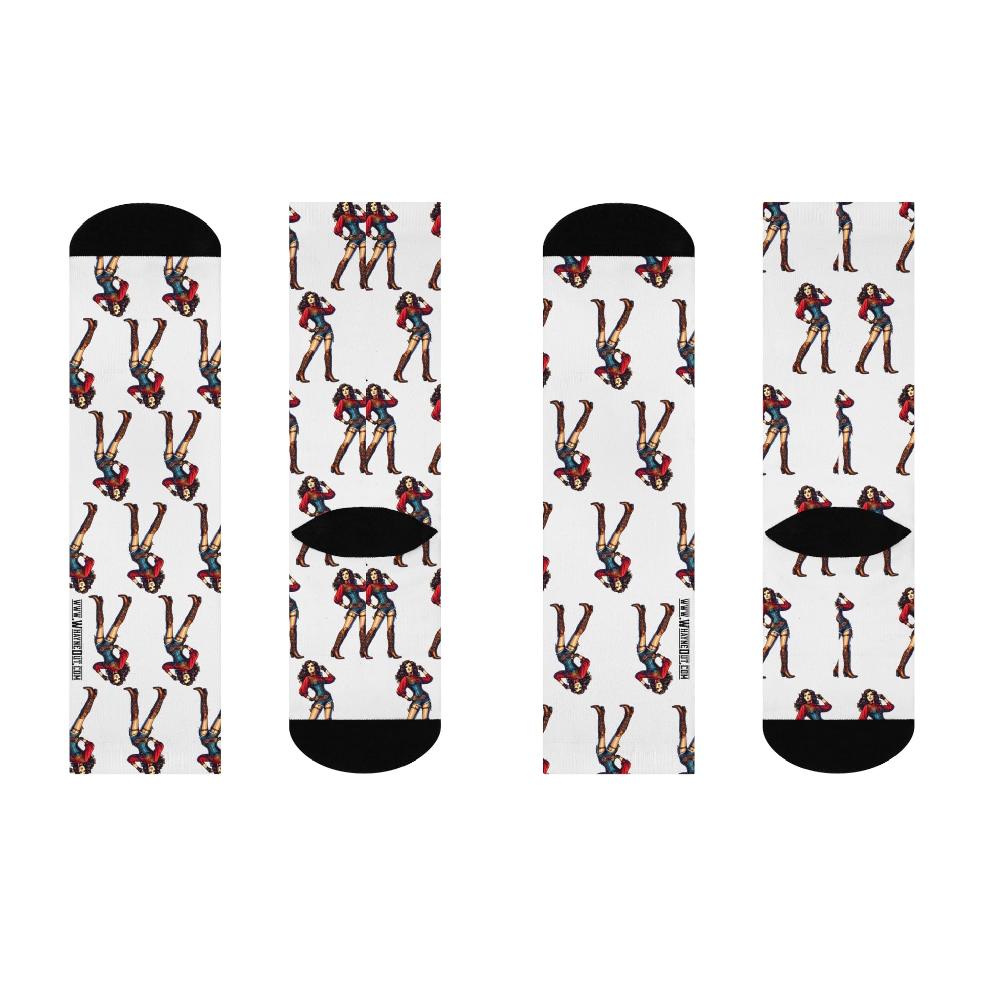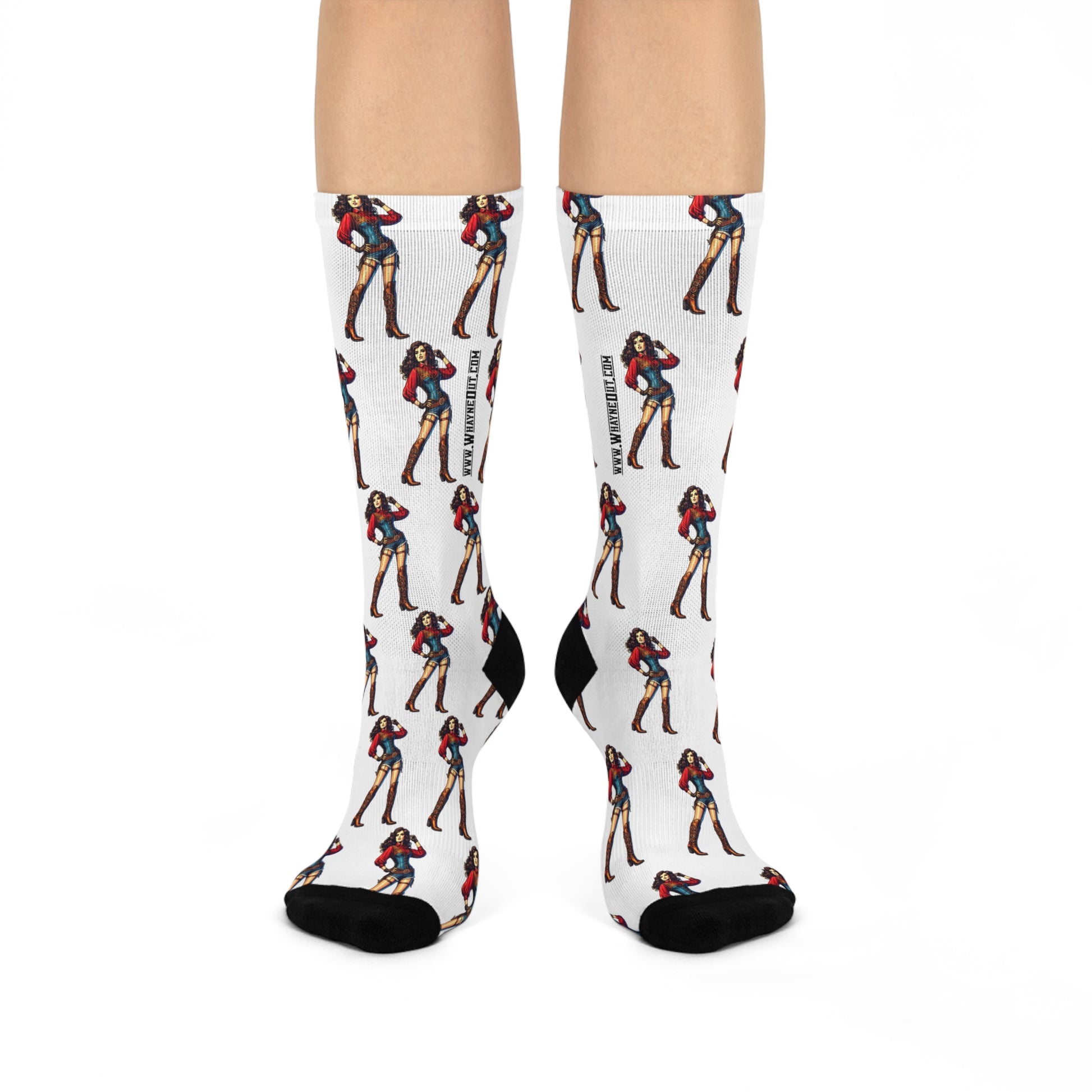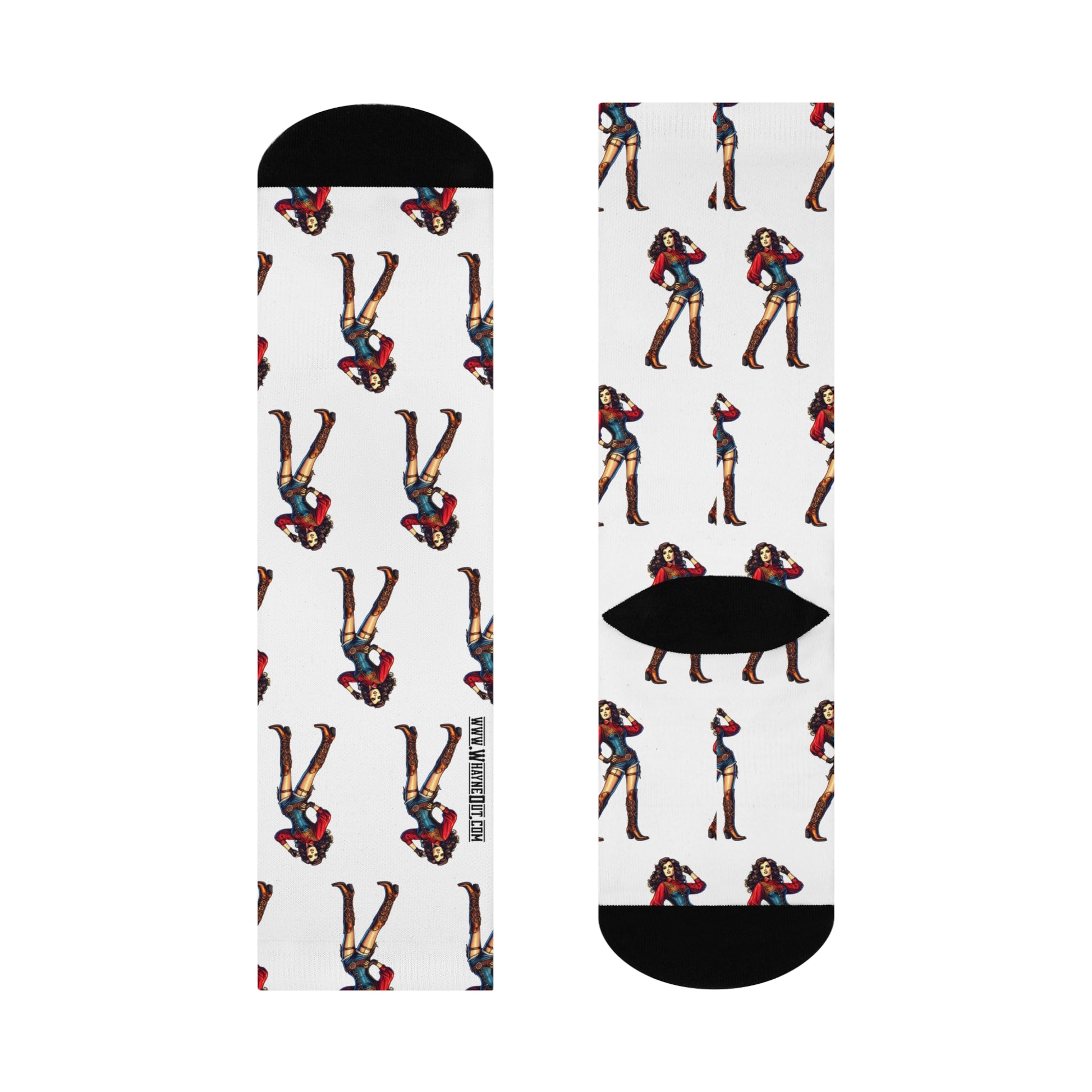 Step into bold western flair with our Western Pin-Up Crew Socks, featuring our signature pin-up cowgirl artwork that brings a confident, sassy vibe to every step. Designed for both standout style and all-day comfort, these premium crew socks are fully cushioned from heel to toe and built to move with you—whether you're kickin' up dust at the rodeo or loungin' on the ranch.