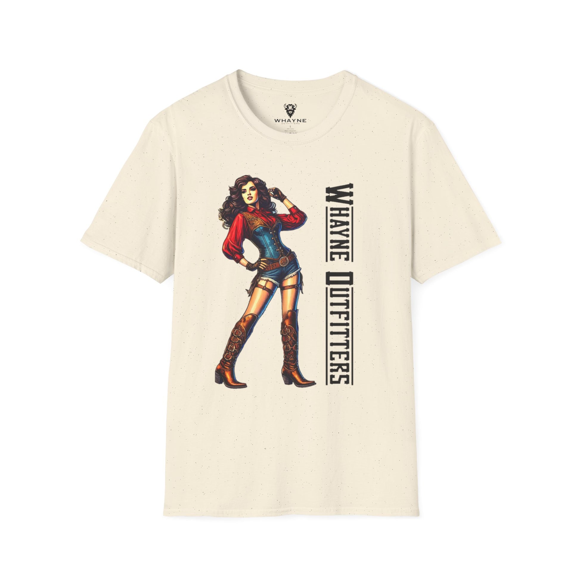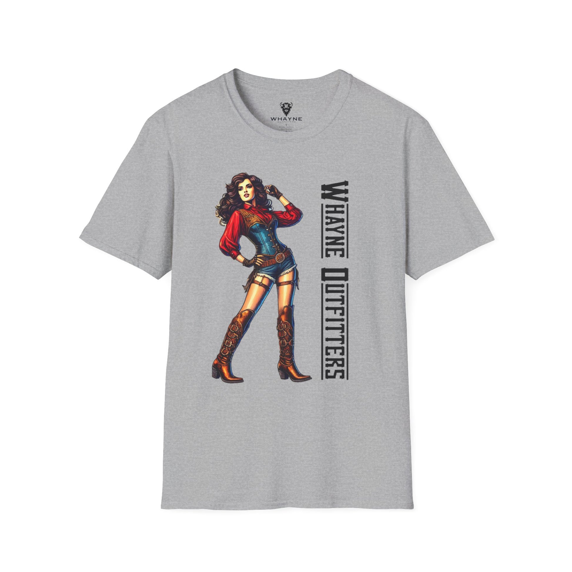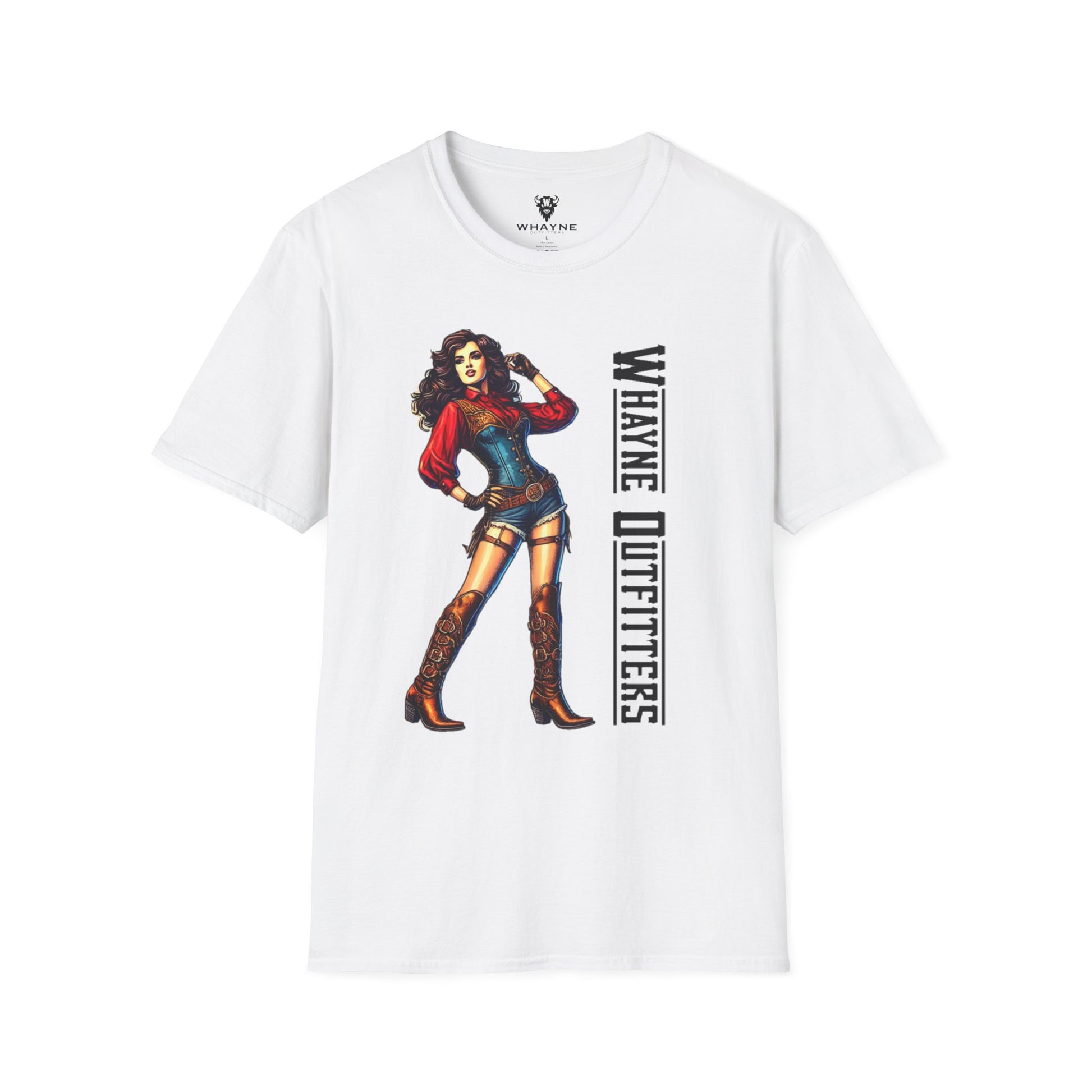She’s tough, sassy, and impossible to ignore—just like this tee. The Cowgirl Icon shirt features a fierce western pin-up rocking a red blouse, denim romper, and tall embroidered boots, standing confidently beside the Whayne Outfitters logo. It’s a modern nod to vintage cowgirl grit.