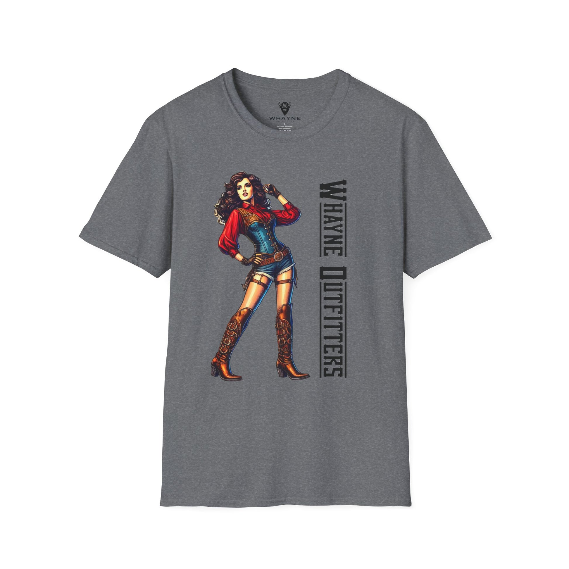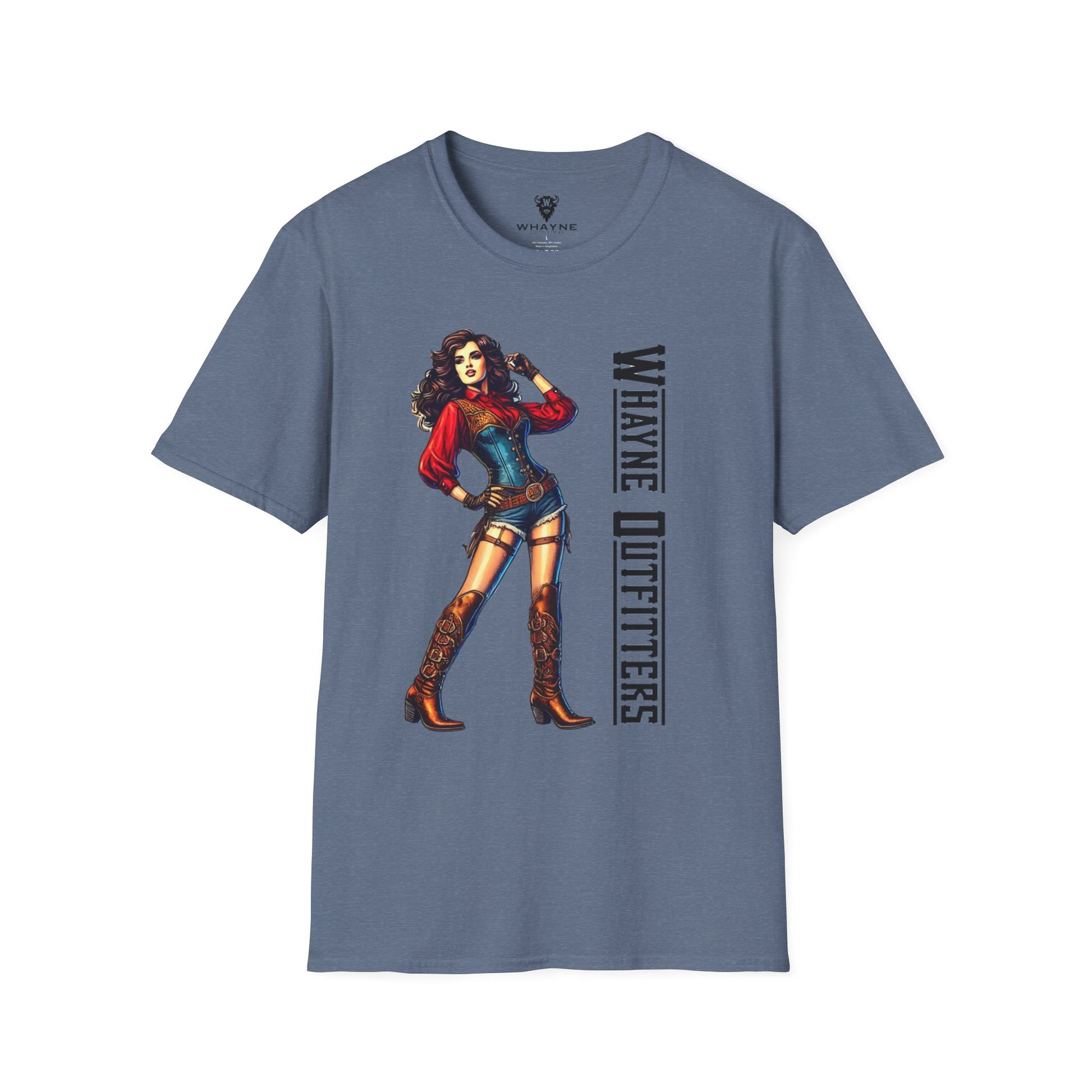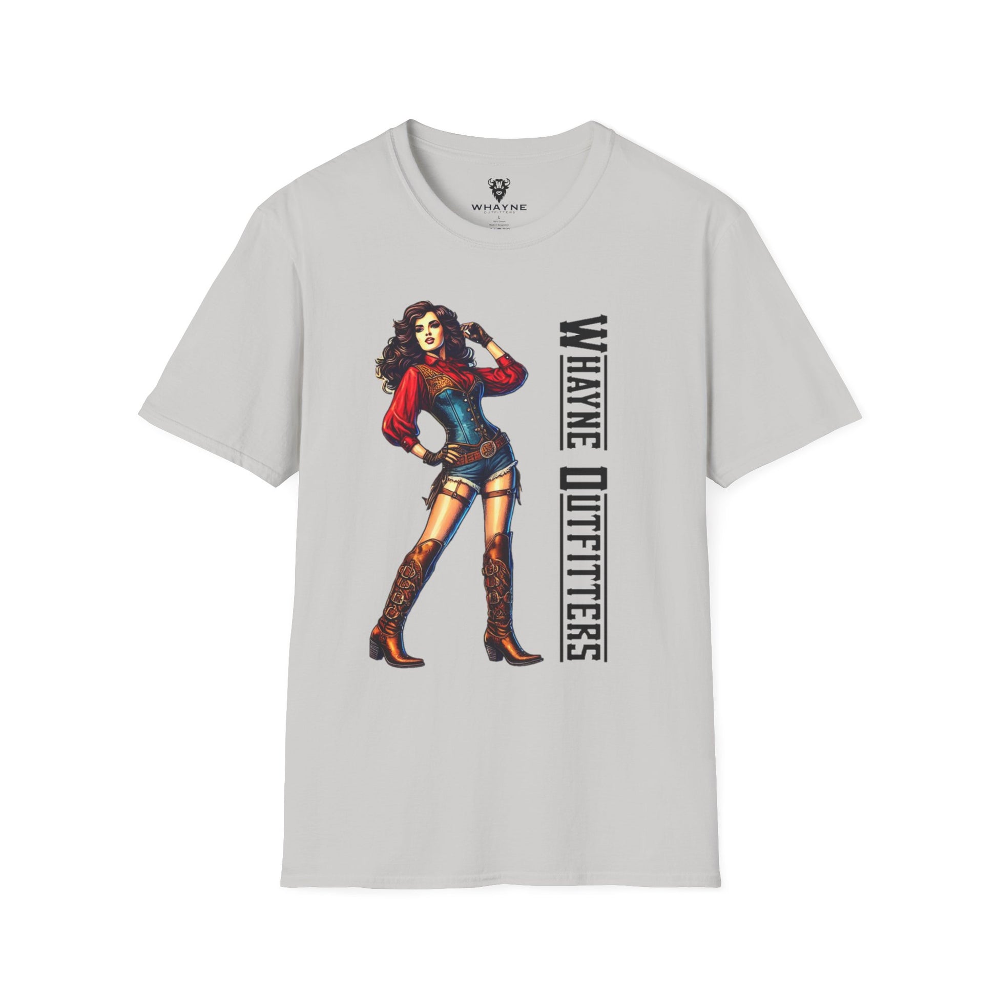 She’s tough, sassy, and impossible to ignore—just like this tee. The Cowgirl Icon shirt features a fierce western pin-up rocking a red blouse, denim romper, and tall embroidered boots, standing confidently beside the Whayne Outfitters logo. It’s a modern nod to vintage cowgirl grit.