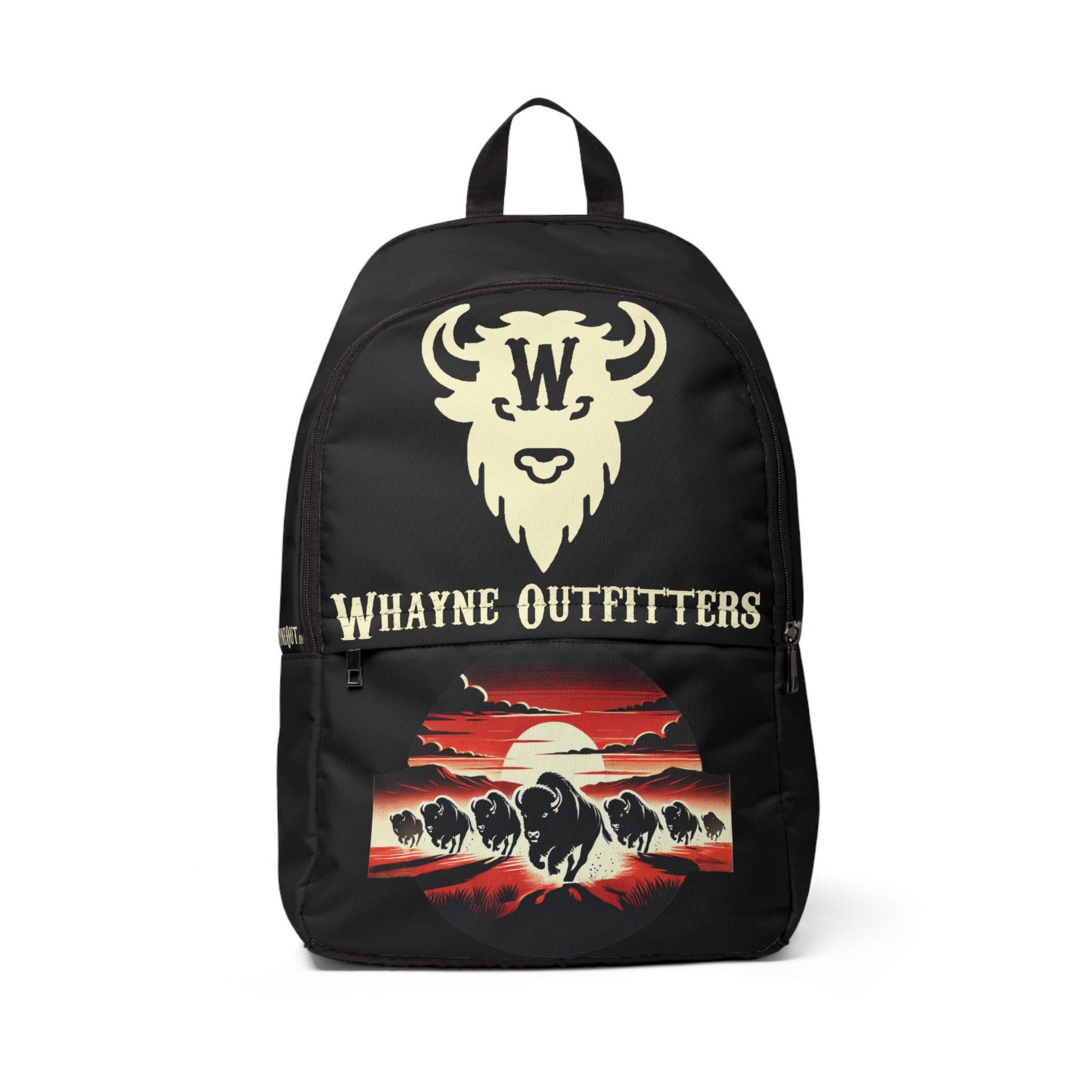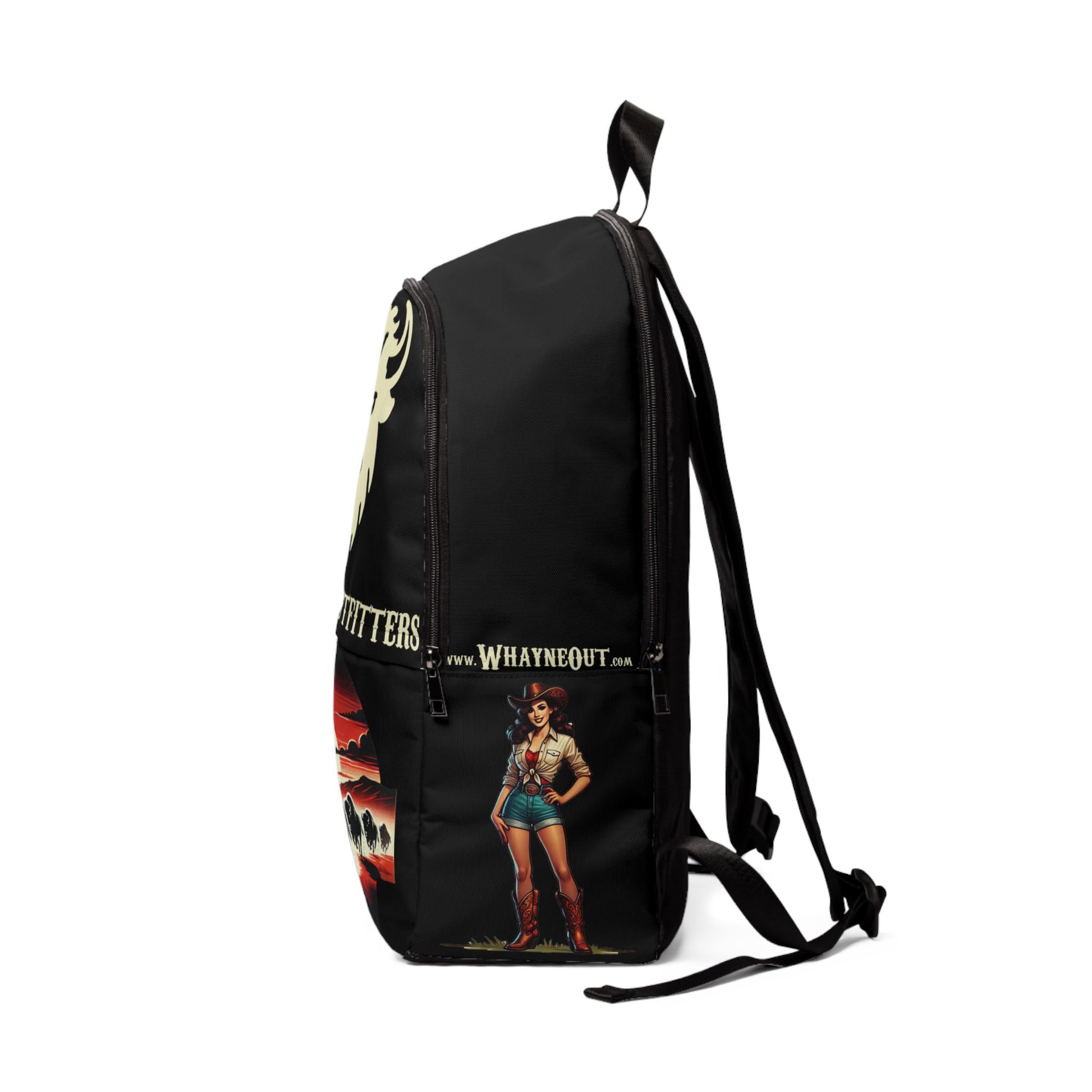 Unleash your wild side with the Roam Free backpack — built for wherever the trail takes you. Featuring our signature roaring bison stampede at sunset and bold Whayne Outfitters branding, this bag blends rugged Western spirit with everyday function. Each side pocket adds a wink of cowgirl charm, reminding you not to take life too seriously… unless it’s about freedom.