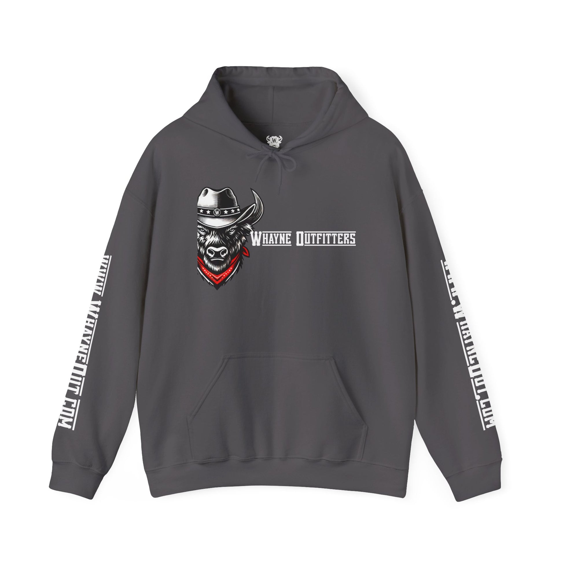 Featuring the signature Whayne Outfitters skull bison head in full bandana-and-hat glory, this unisex heavy blend hoodie wraps you in warmth and western grit. With bold sleeve prints and a centered front logo, it doesn’t whisper attitude—it hollers it.
