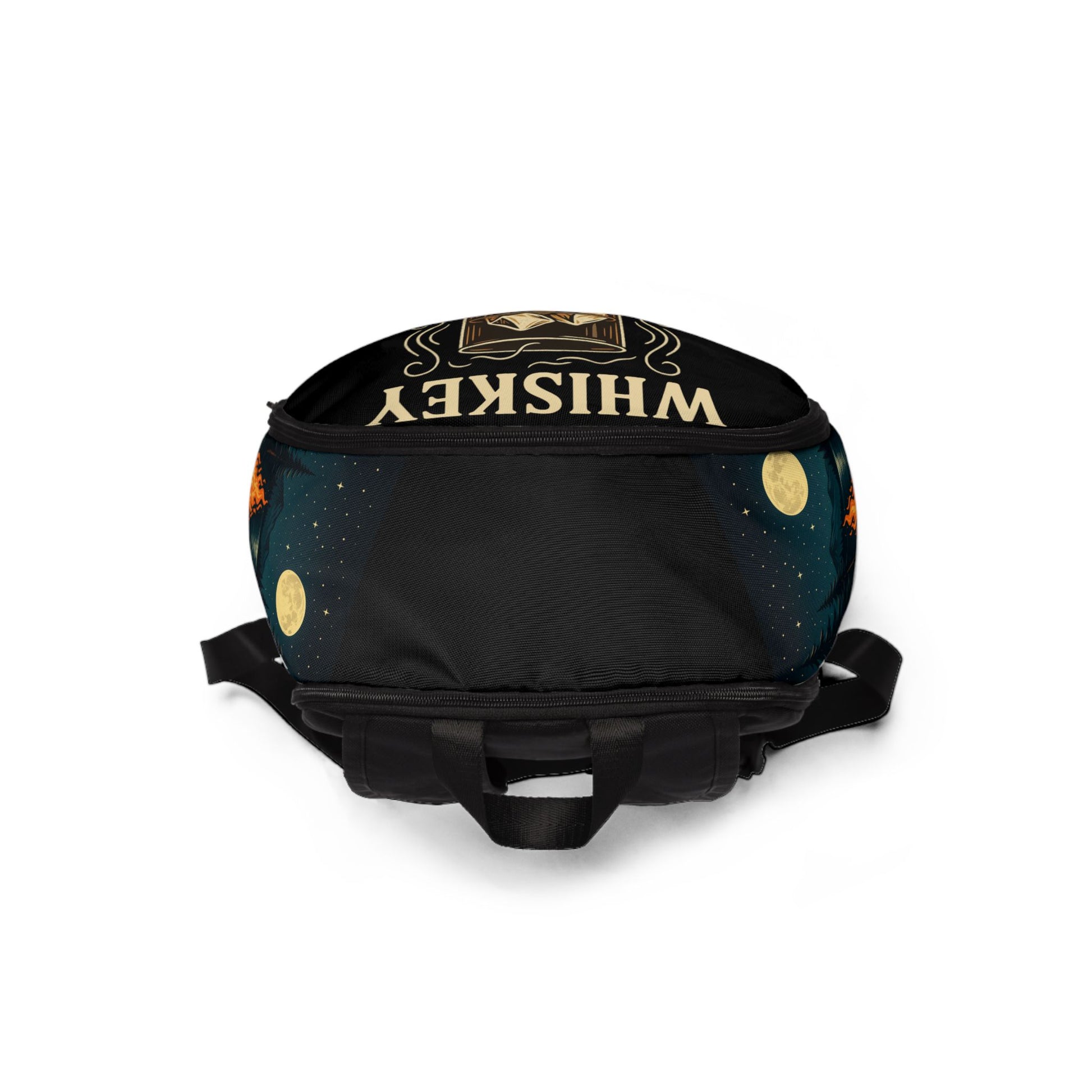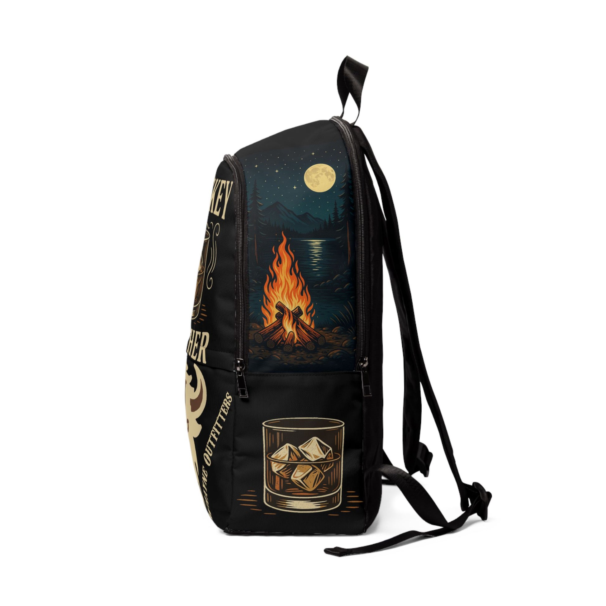 The side panel artwork showcases a serene moonlit campfire by a lake – perfect for those who live for evenings under the stars, telling stories and making memories. Lightweight yet durable, this waterproof backpack is built to hold your laptop, books, or a bottle of your favorite bourbon.