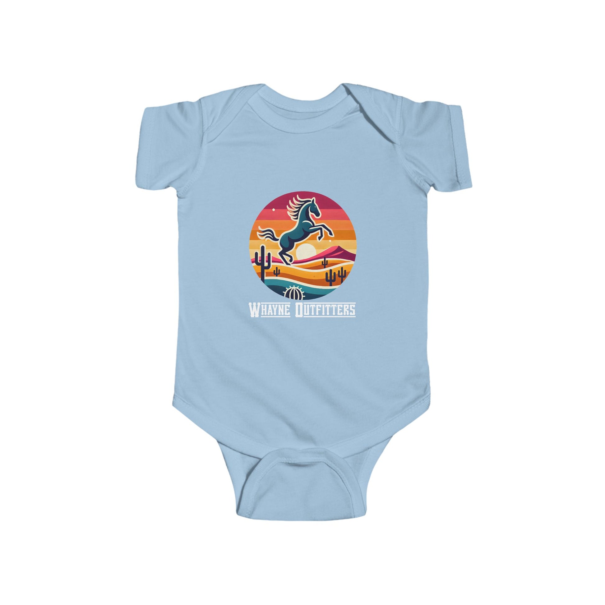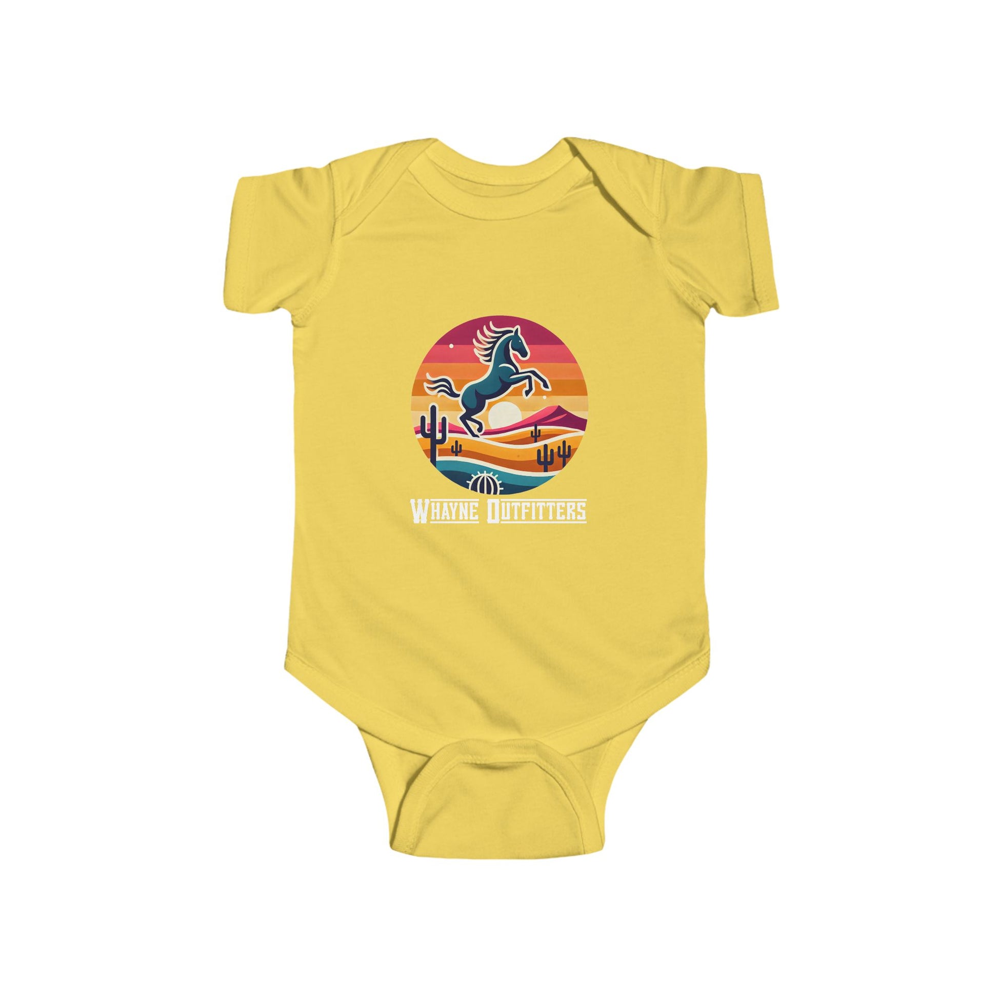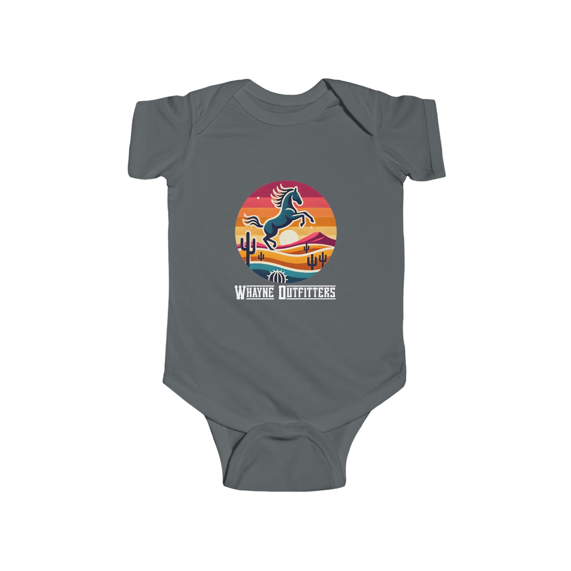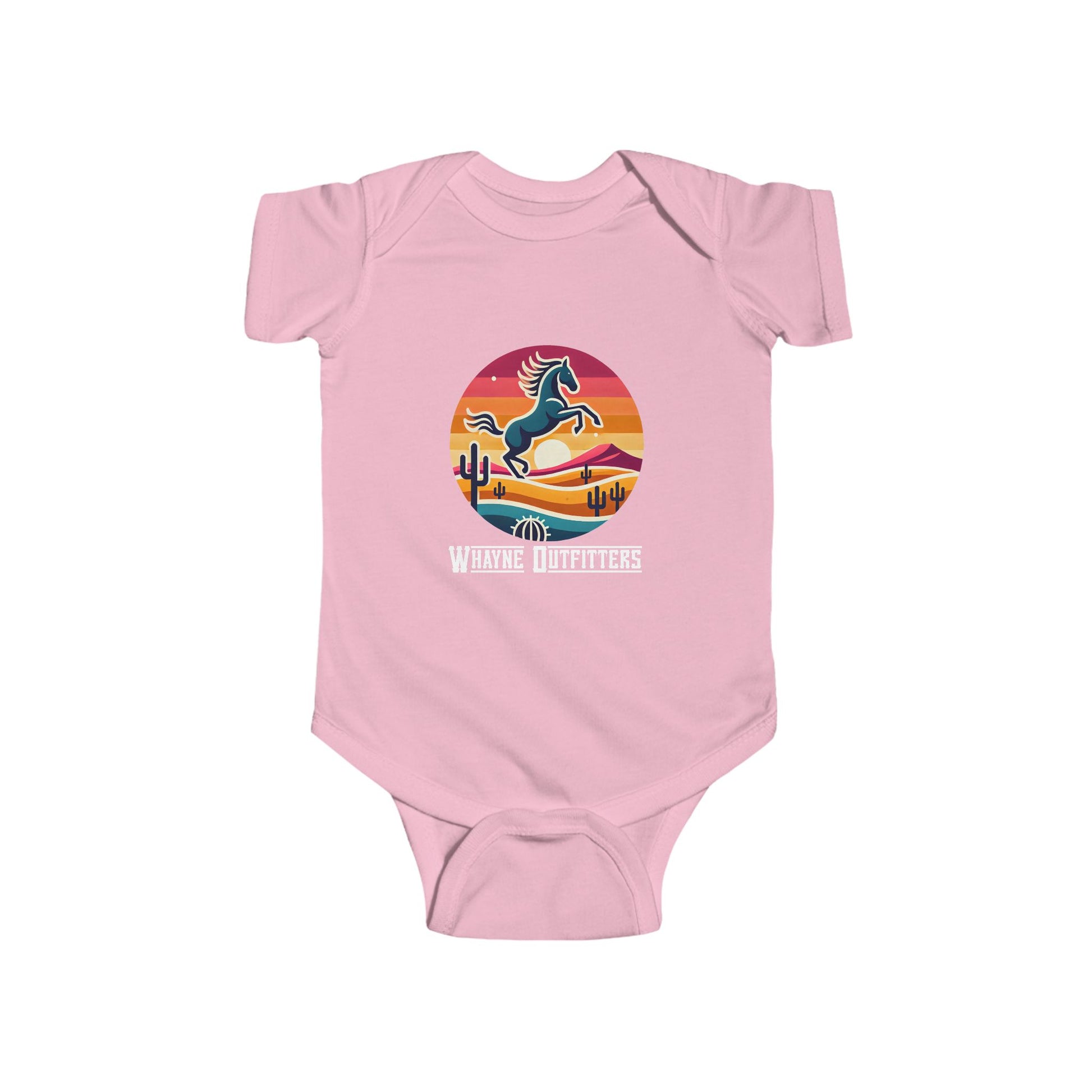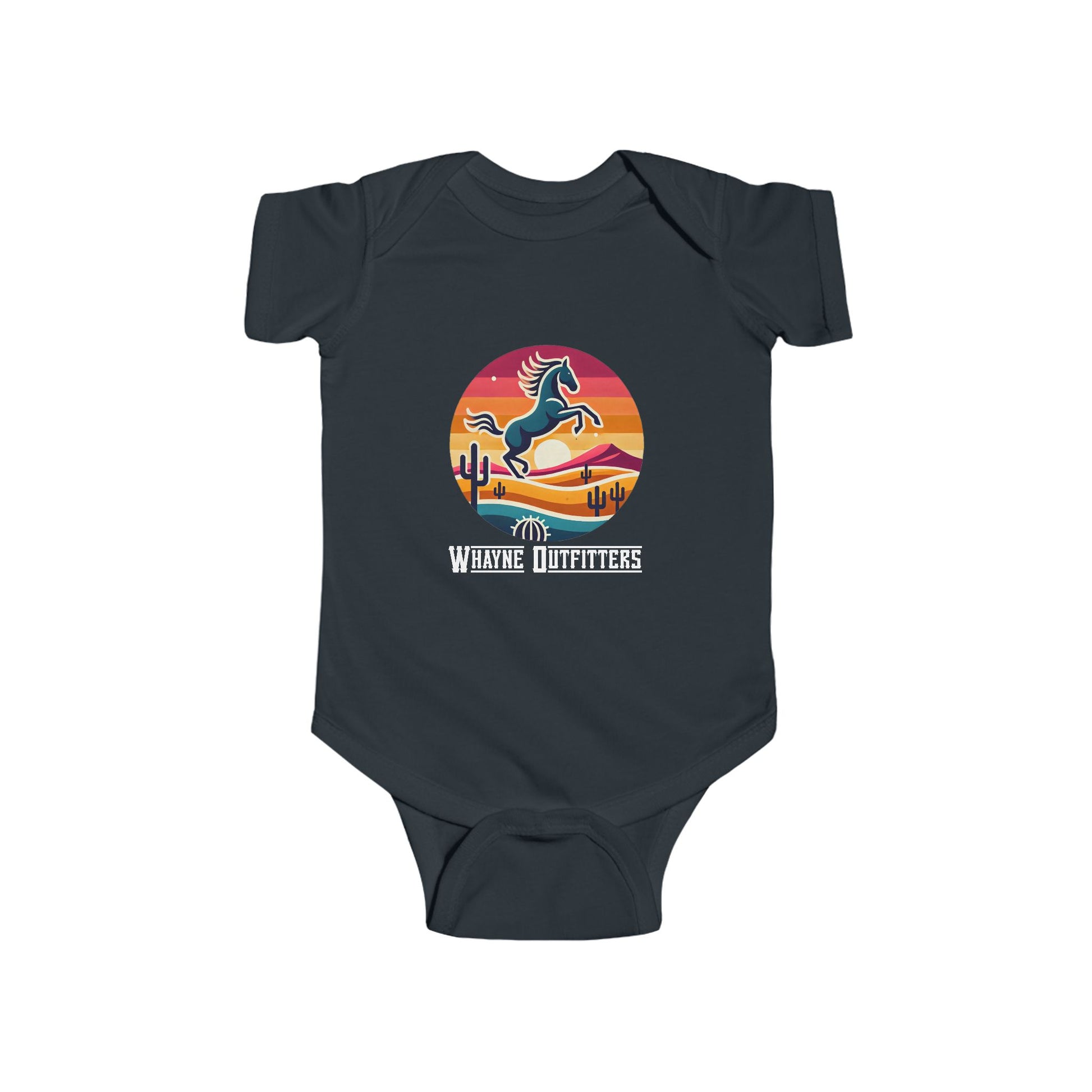 Let your little one’s wild side shine with our Wild Spirit Baby Bodysuit! Featuring a bold desert sunset, cactus silhouettes, and a galloping horse graphic, this design is full of color and energy—just like your mini wrangler. Finished with the Whayne Outfitters logo, it's a tribute to freedom, adventure, and that untamed spirit we love.
