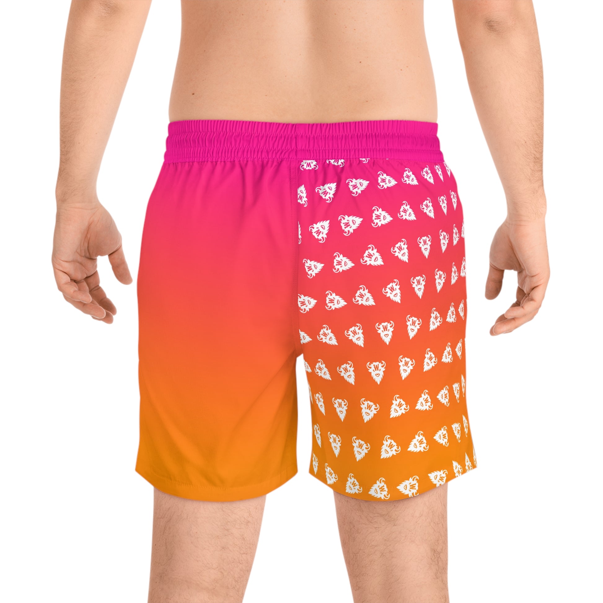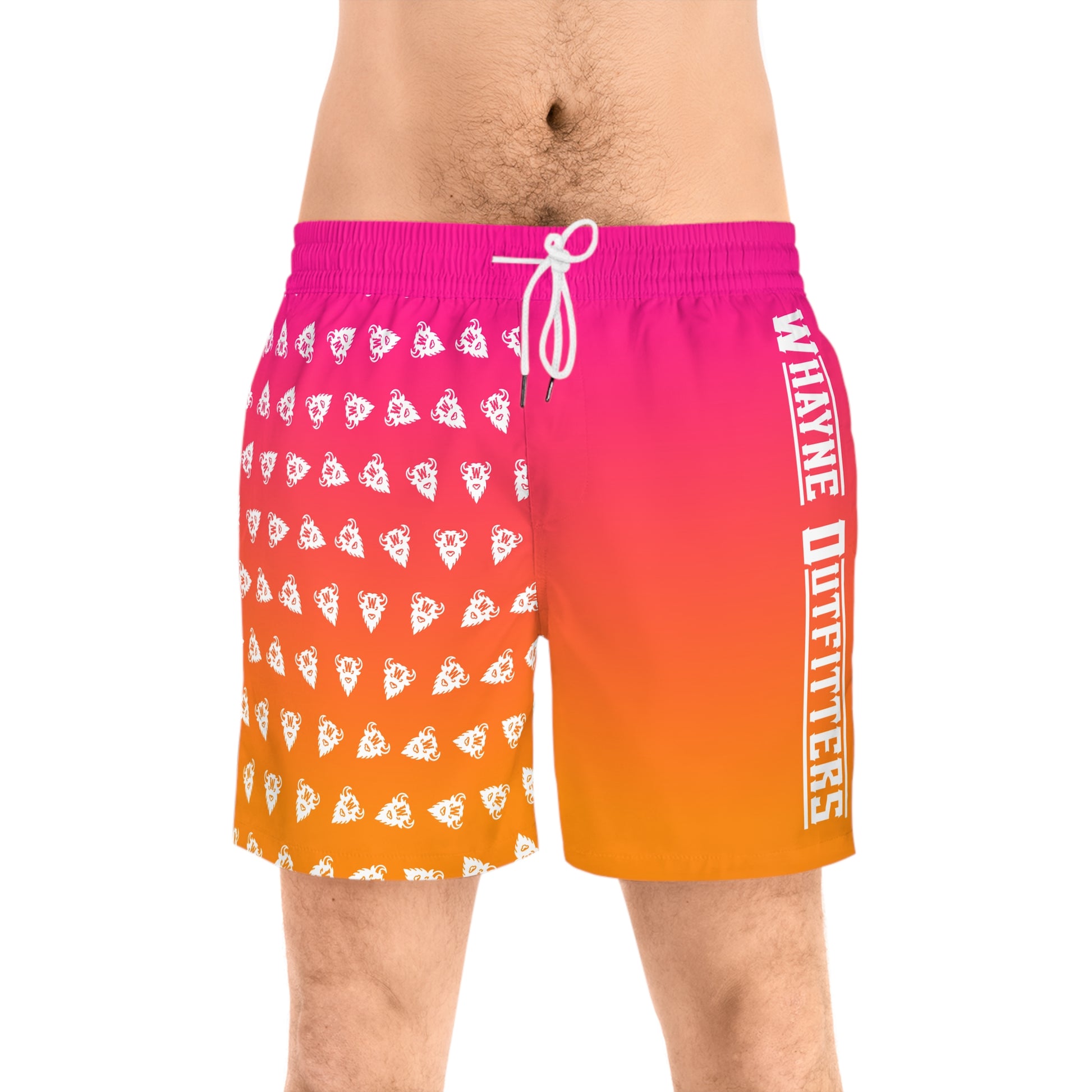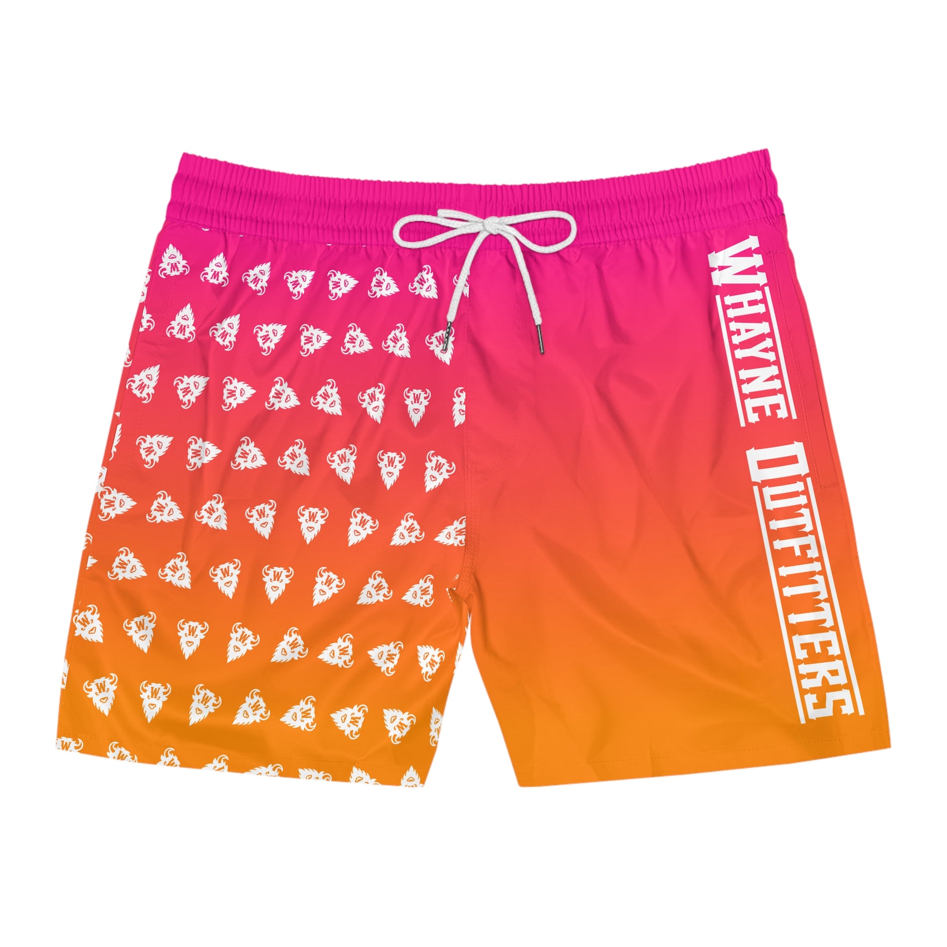 Turn up the color and the comfort with the Bloom Swim Shorts. Featuring a vibrant fuchsia-to-orange gradient and an all-over Whayne bison head pattern, these trunks are made for standout summer days. Crafted from a lightweight poly-spandex blend, they include an inner mesh brief, side pockets, and adjustable drawstring waist for laid-back wear at the beach, pool, or lake. Bold branding runs down the leg, adding that unmistakable Whayne edge to a classic silhouette.